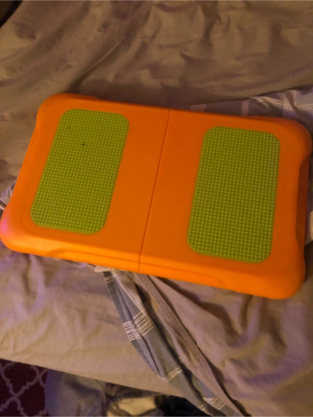 This is an orange and green balance board. It has two textured green pads for grip. It's designed for balance exercises and games. This would be useful for fitness enthusiasts or for active gaming sessions! For wii system