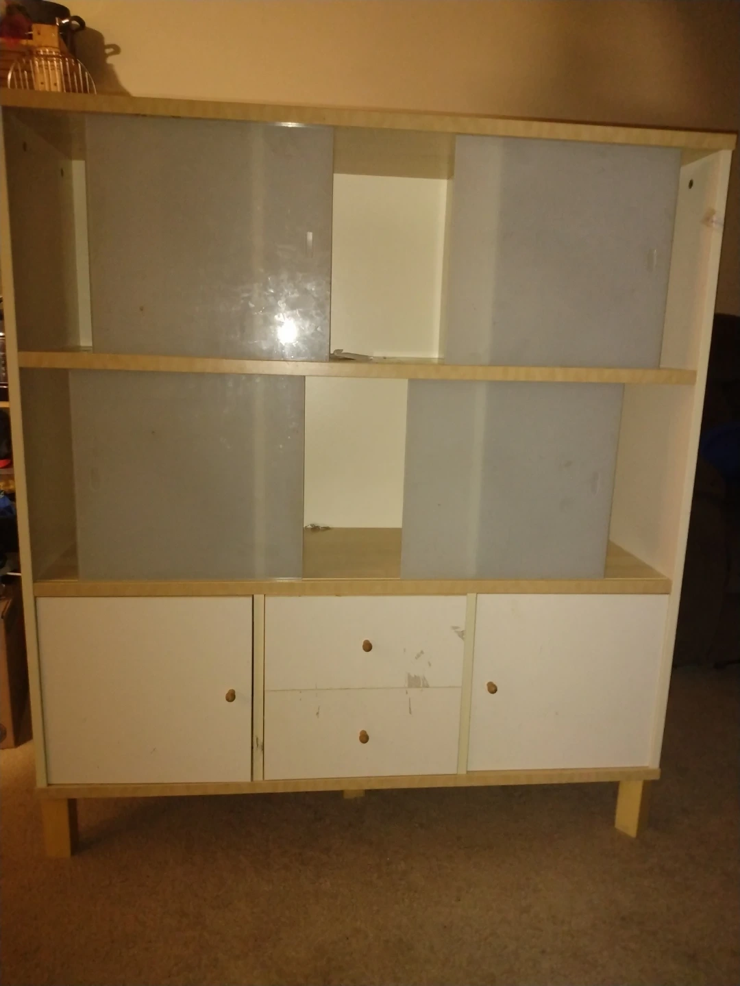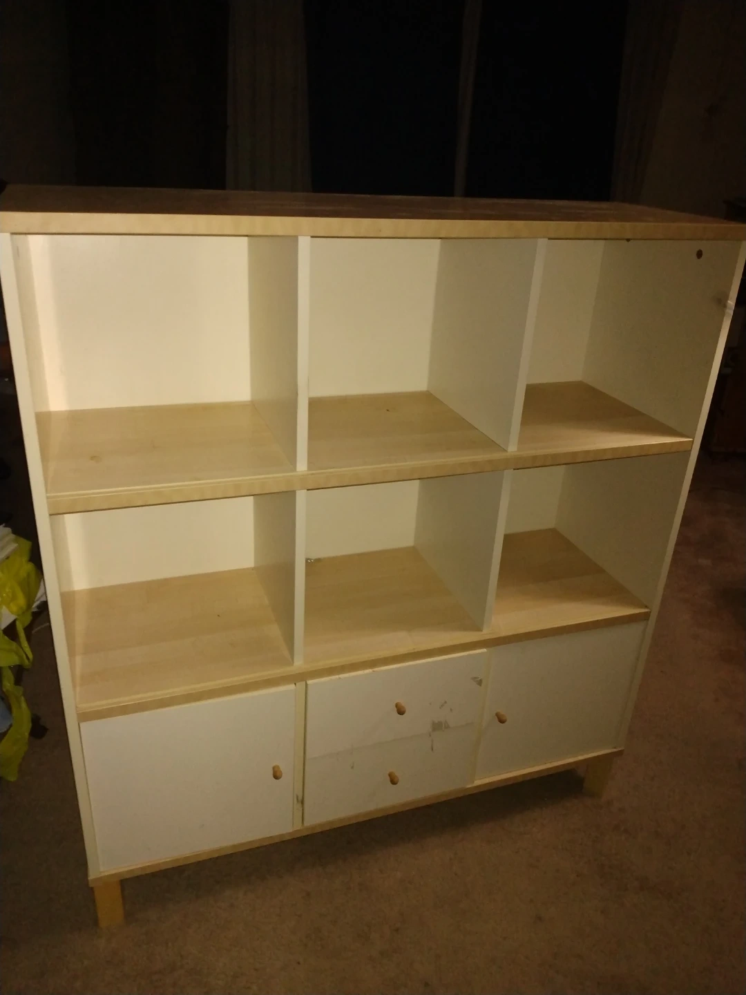This is a versatile storage unit with a combination of open shelves and cabinet doors. It's made of particleboard with a wood-effect trim and has a light wood-tone interior. Some doors have small wooden knobs for opening. It's useful for organizing various items around the house.