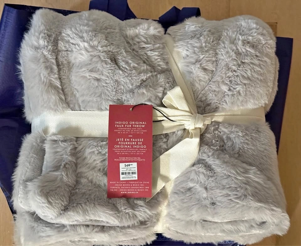 Brand new with tags. This is the Indigo Original Faux Fur Throw in a beautiful, soft grey. It’s incredibly plush, cozy, and perfect for curling up on the sofa or adding a touch of luxury to your bedding.