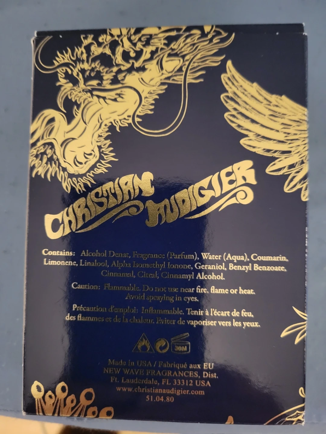 Christian Audigier Eau de Toilette Natural Spray for men. This fragrance comes in a 50 mL bottle. It contains Alcohol Denat, Fragrance (Parfum), Water, Coumarin, Limonene, Linalool, Alpha Isomethyl Ionone, Geraniol, Benzyl Benzoate, Cinnamal, Citral, and Cinnamyl Alcohol. Avoid spraying in eyes.