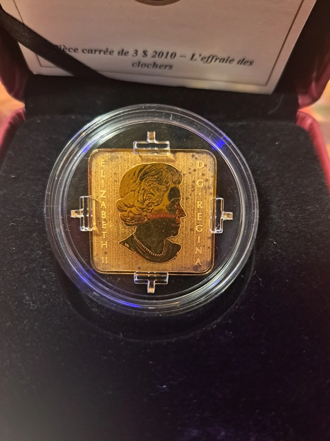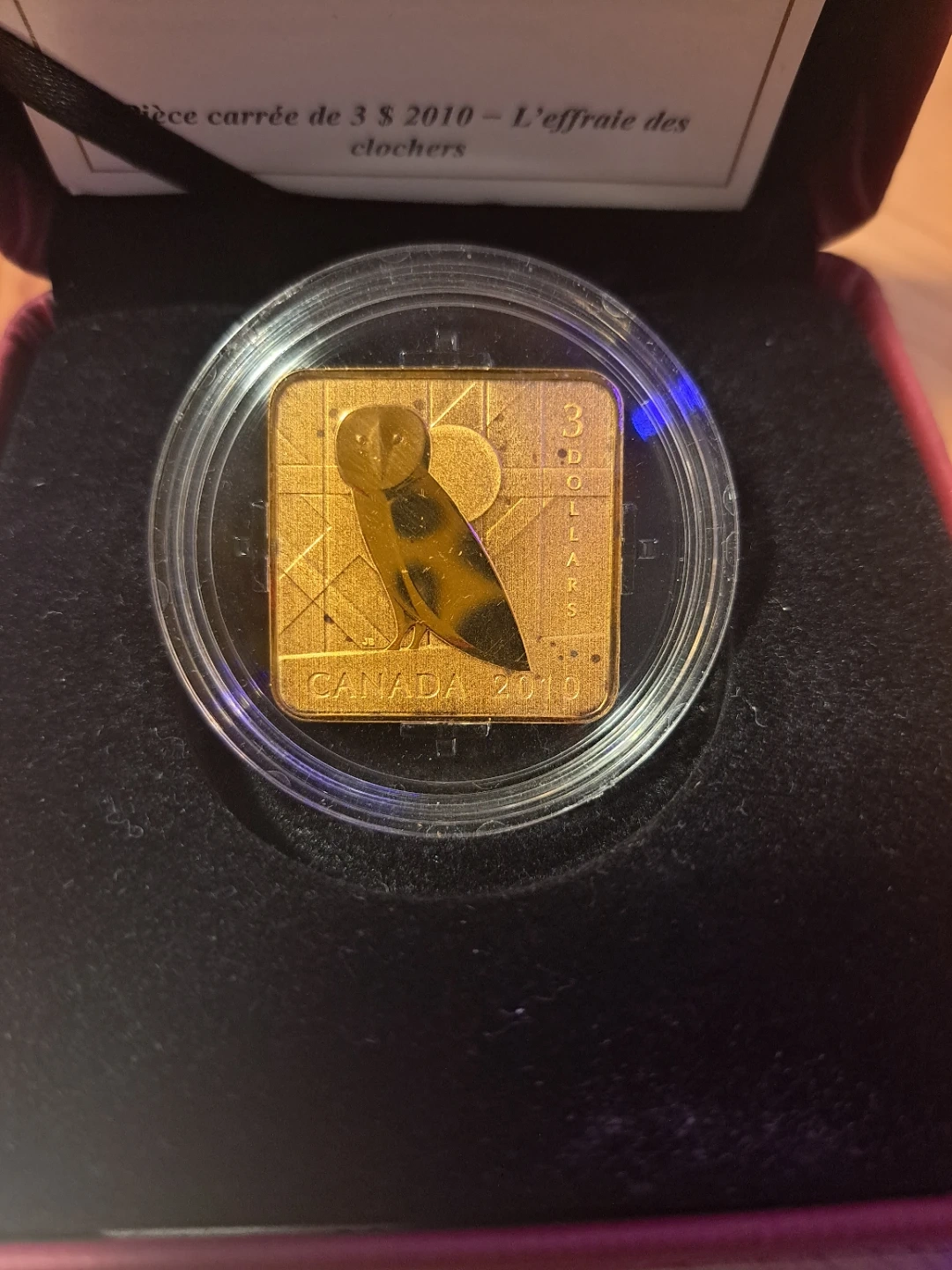 This sterling silver coin is plated in 24 karat gold and features a square design. It measures 27.00mm and weighs 11.71 grams. The coin depicts the Barn Owl on one side and Queen Elizabeth II on the other. It's from the Royal Canadian Mint's 2010 collection with a limited mintage of 15,000.