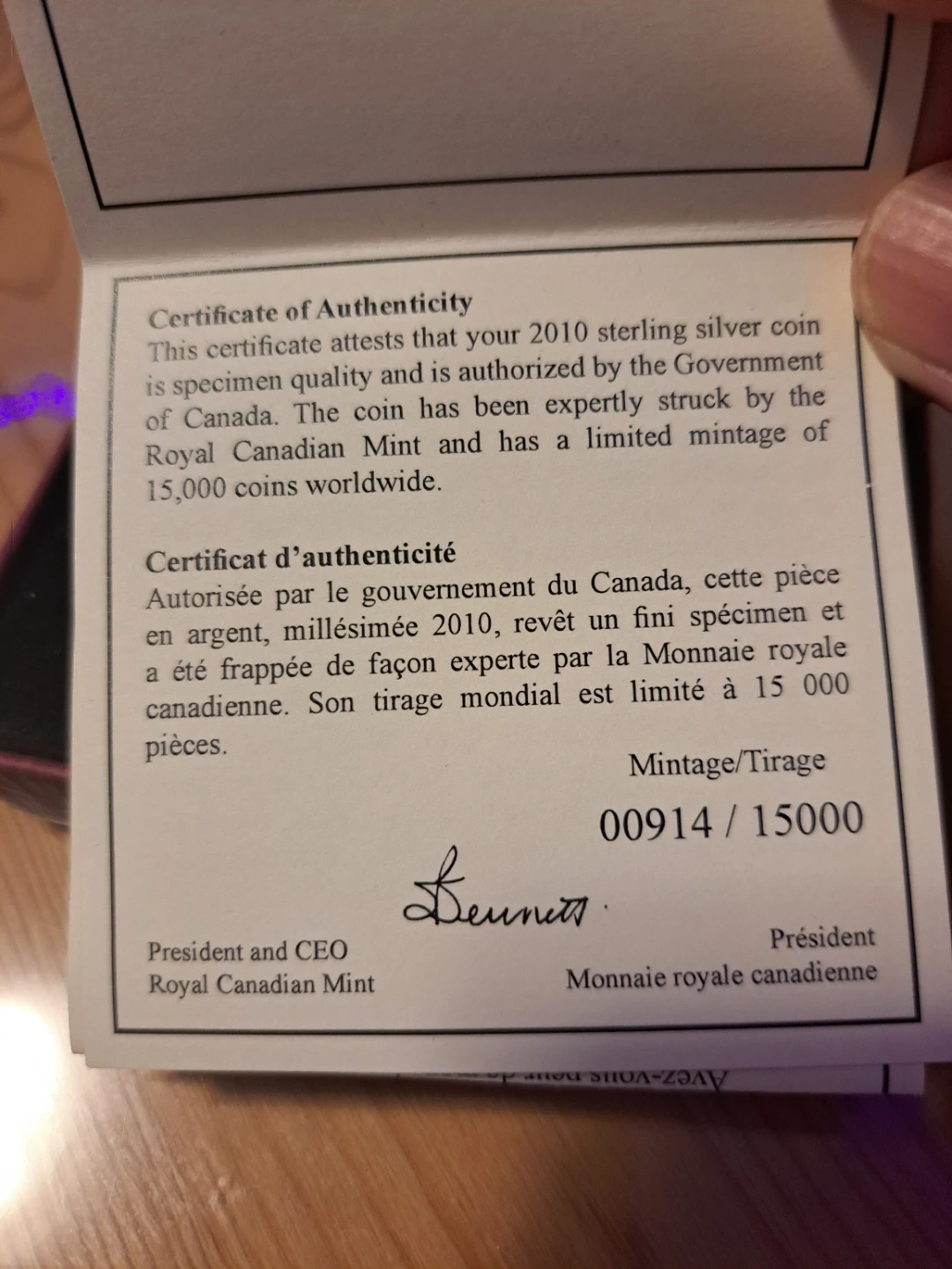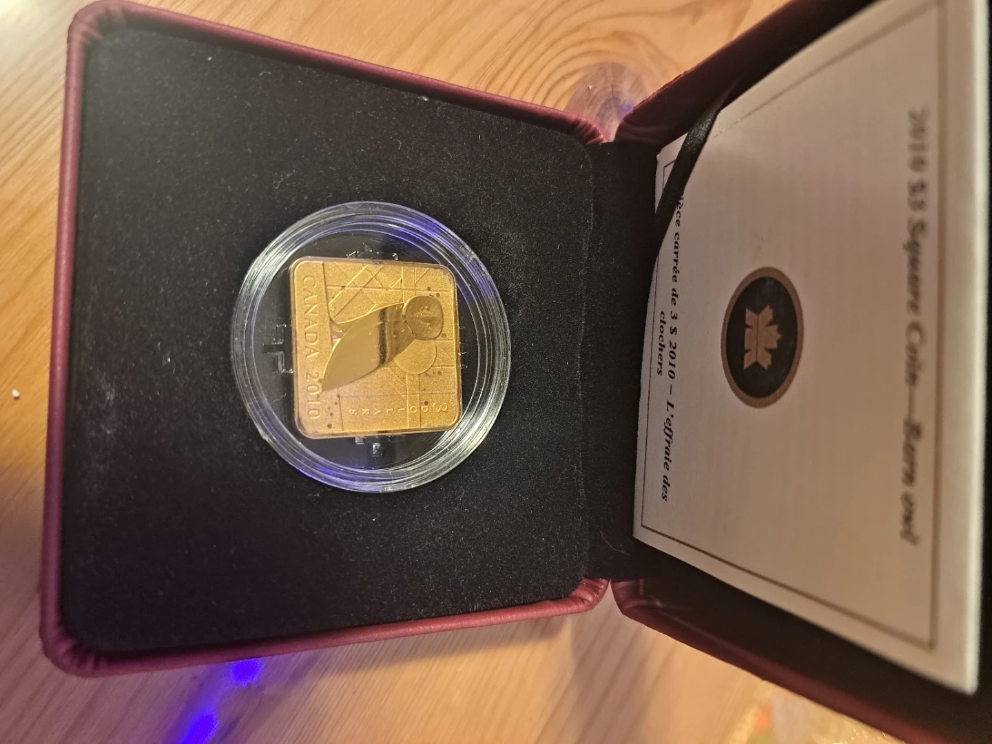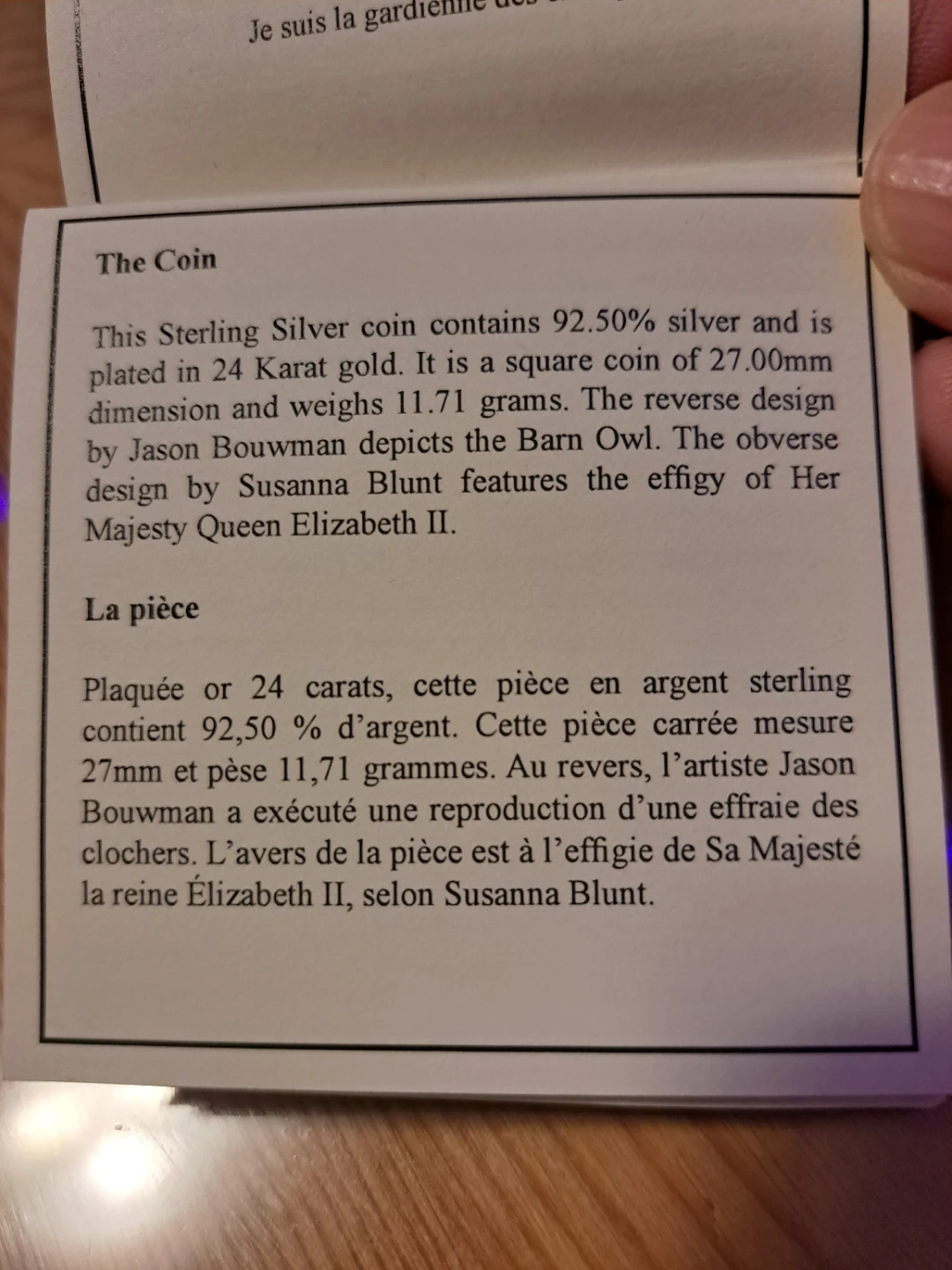 This sterling silver coin is plated in 24 karat gold and features a square design. It measures 27.00mm and weighs 11.71 grams. The coin depicts the Barn Owl on one side and Queen Elizabeth II on the other. It's from the Royal Canadian Mint's 2010 collection with a limited mintage of 15,000.