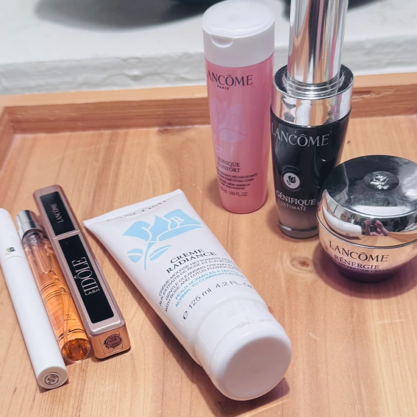 This is a collection of Lancôme skincare and makeup items. It includes Lancôme Génifique Ultimate, Rénergie H.P.N. 300-Peptide Cream, Crème Radiance Gentle Cleansing Creamy-Foam (125 ml / 4.2 FL. OZ.), Tonique Confort Re-hydrating Comforting Toner (50 ml / 1.69 FL. OZ.), Lancôme Cils Booster XL, a "La Vie Est Belle" fragrance sample, and Idôle Lash Mascara. Great for beauty enthusiasts wanting to try multiple Lancôme products! I have recently acquired these. I have tried the creams and do not prefer the scent. I have tried the cleanser but prefer another I may have tried the toner. The rest are untried.