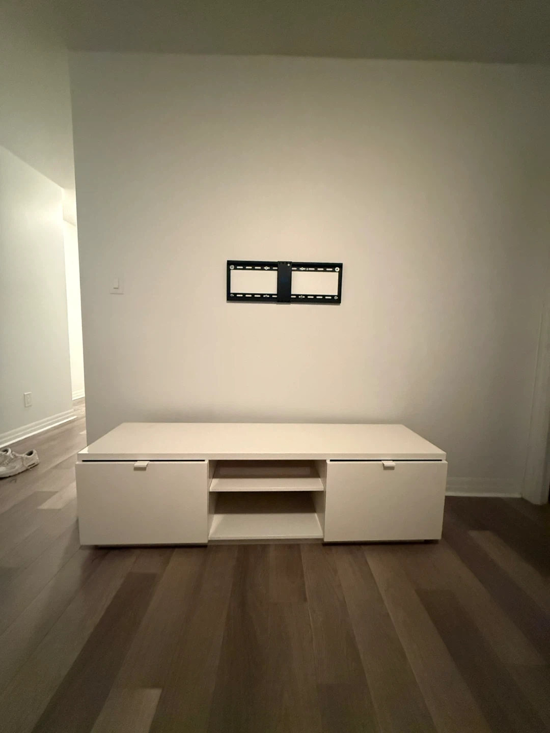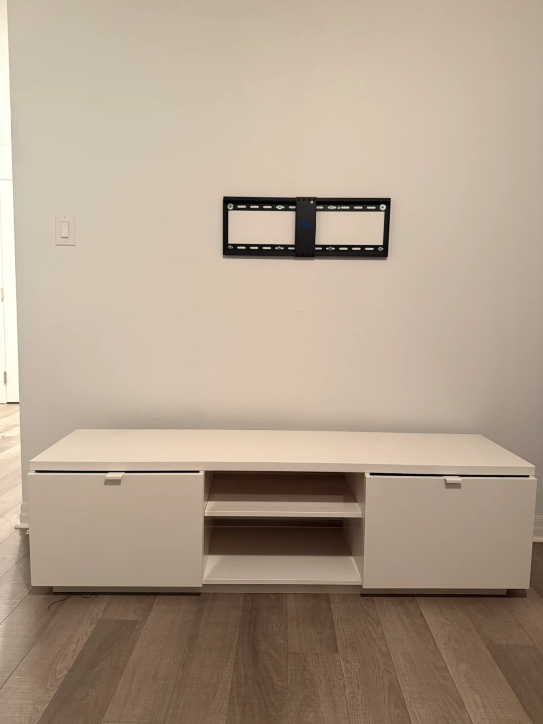 A clean white TV stand featuring two cabinets and open shelving. It's a minimalist design that offers ample storage space for media consoles and accessories. Perfect for organizing your living room entertainment area!