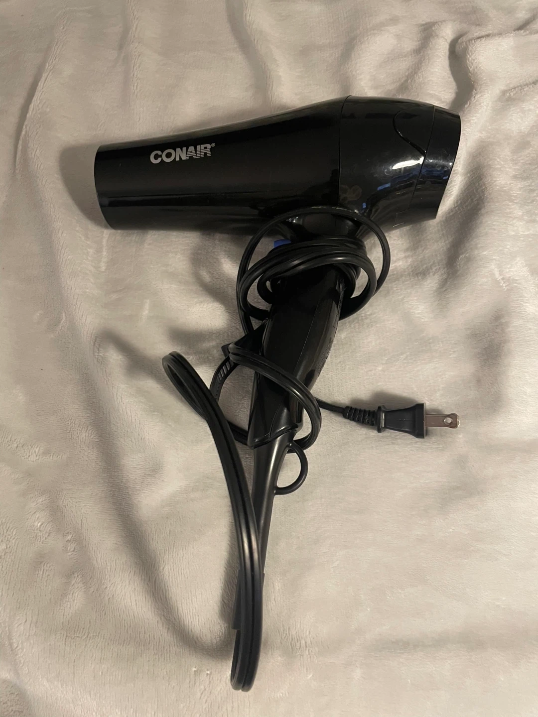 This is a black Conair hair dryer. It has a foldable handle and a concentrator nozzle. It's perfect for quick drying and styling your hair.
