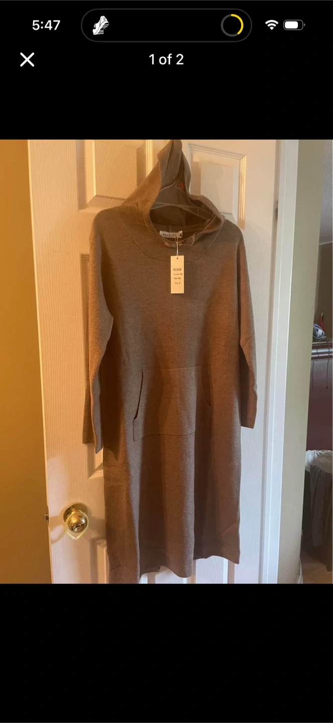 This Bila Rode hoodie dress is a stylish and comfortable piece. It features a relaxed fit with a front kangaroo pocket and a cozy hood. The dress is a size 8. It's perfect for casual wear or layering!