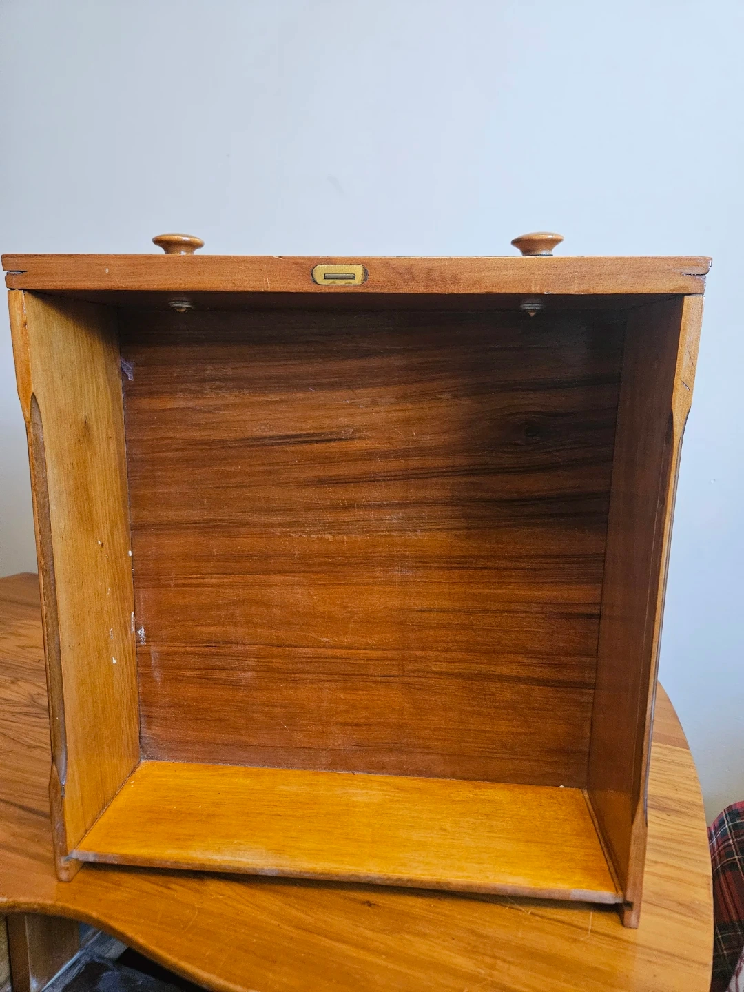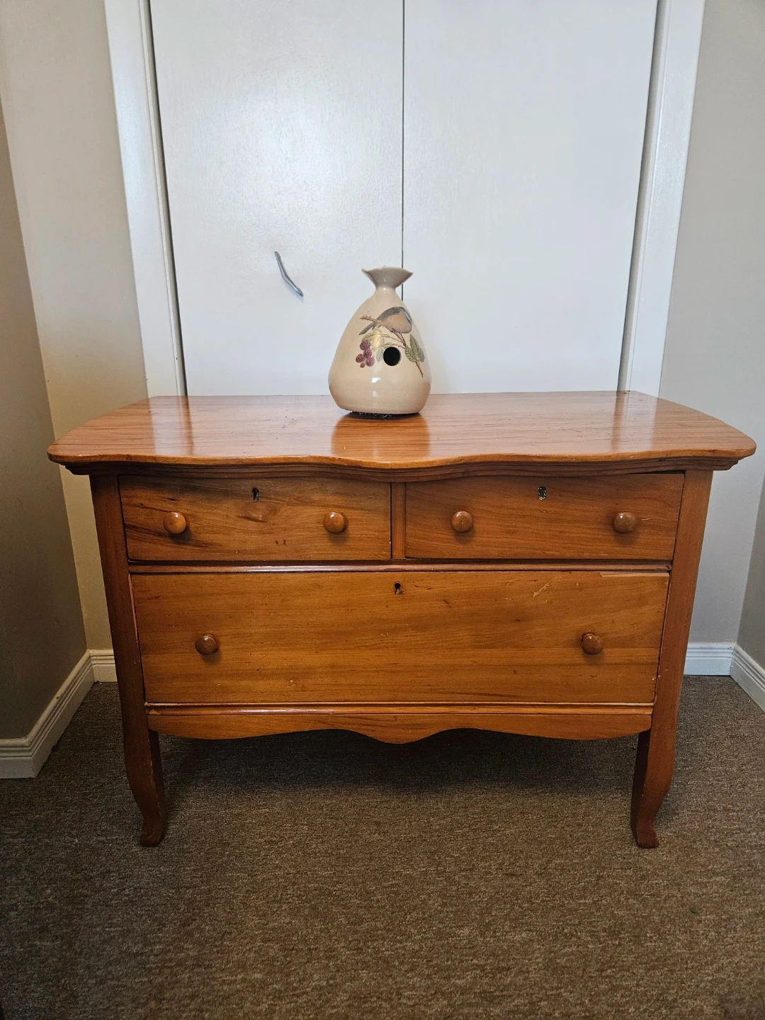 A bintage wooden dresser with a warm, natural finish and 3 drawers. It features decorative metal pulls and a unique curved apron. This piece has a classic design that complements many decor styles.
