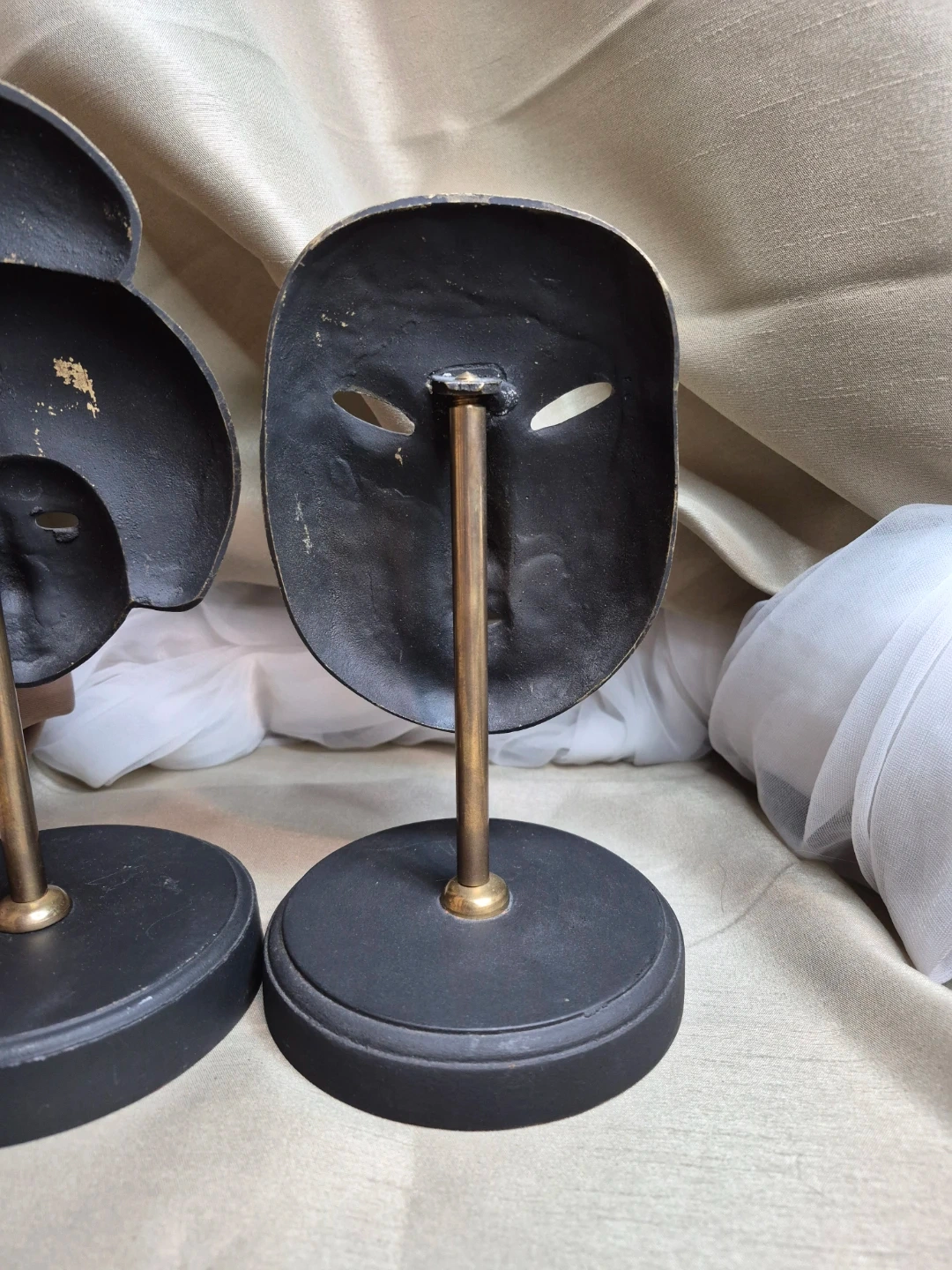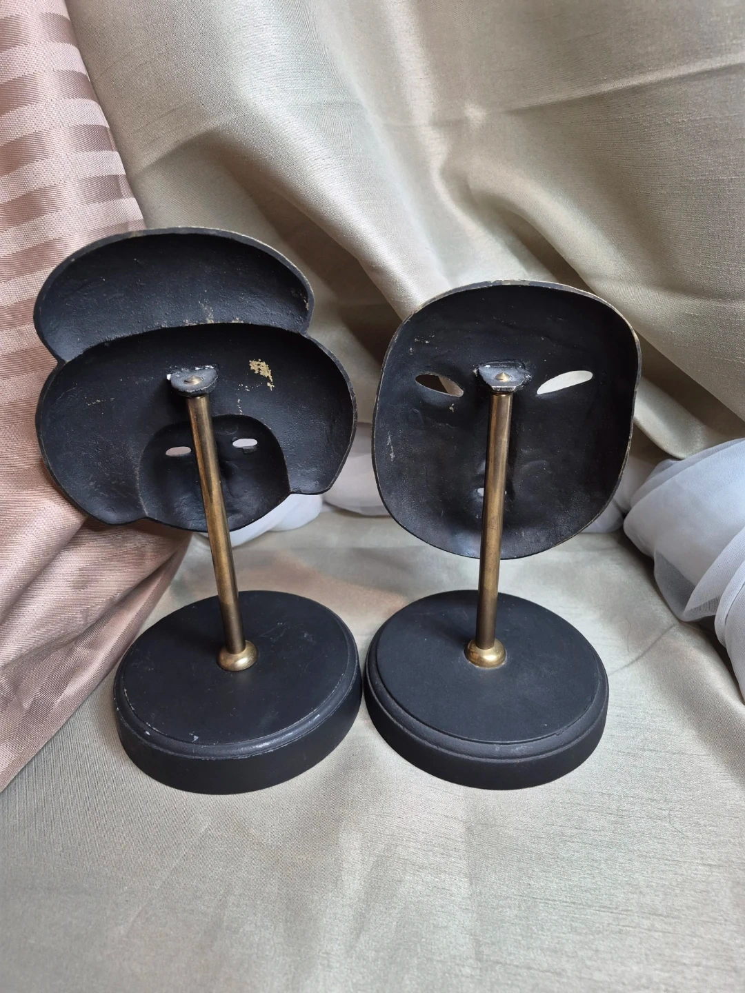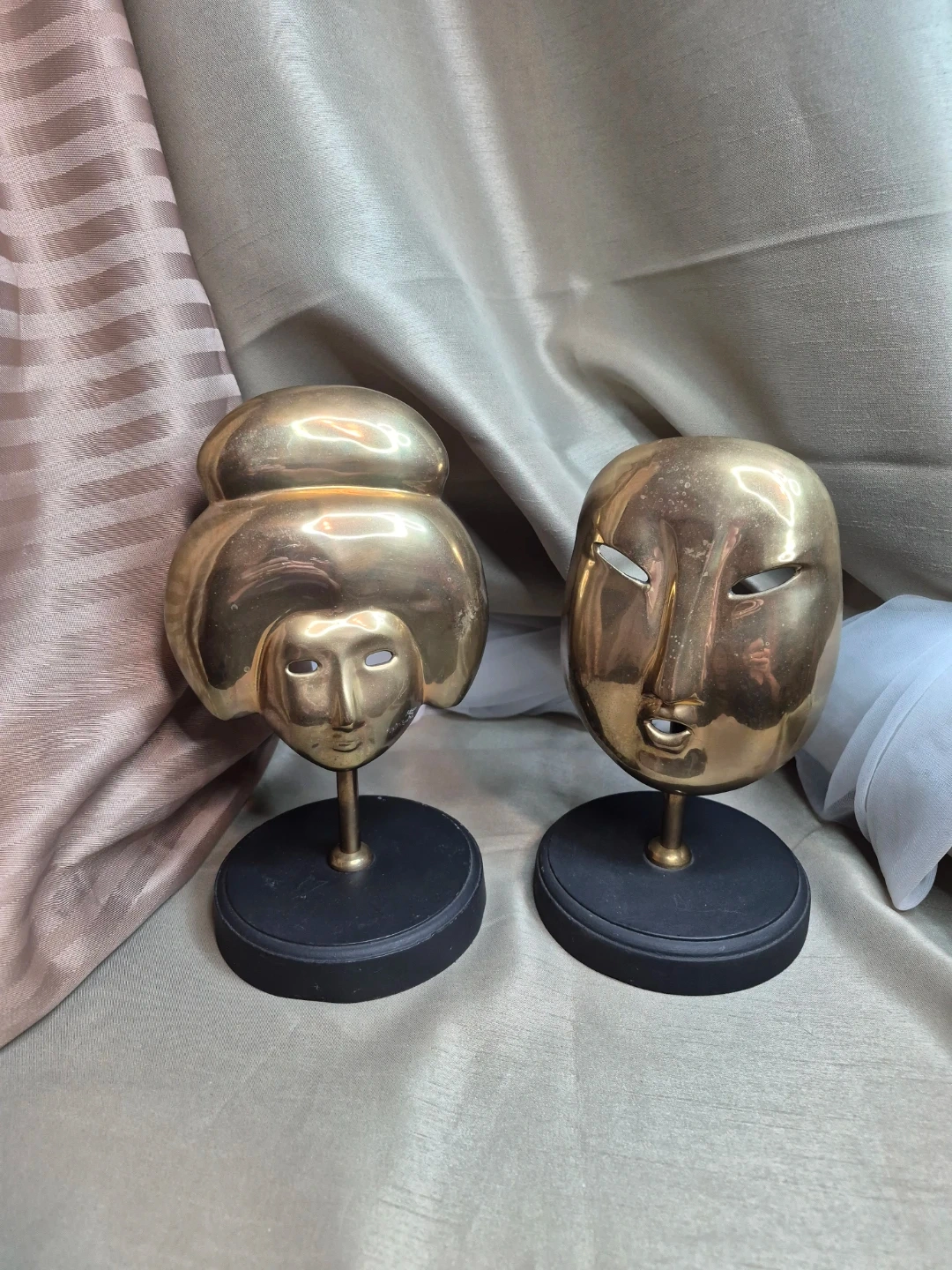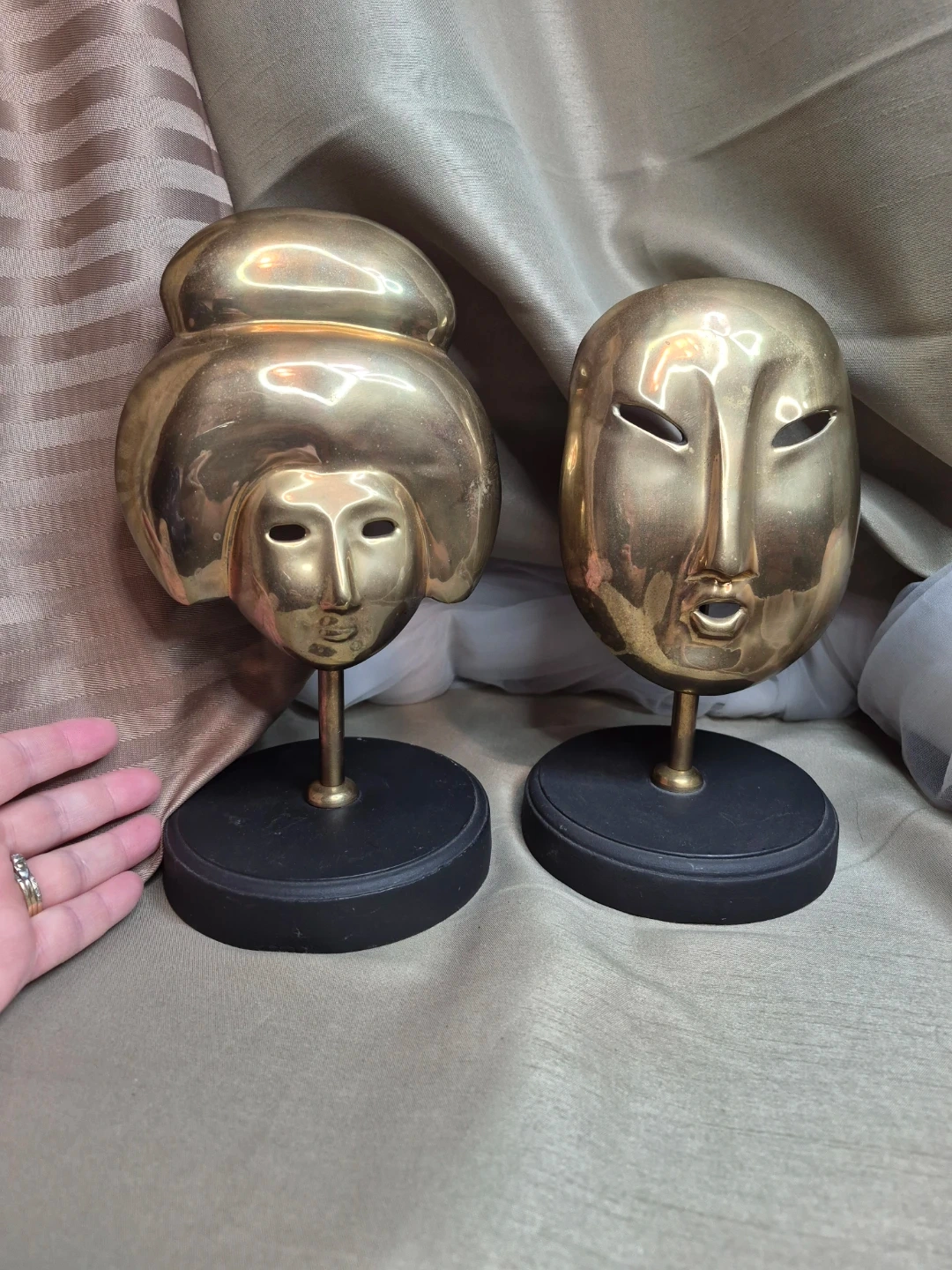 Pair of Vintage Solid Brass 9 1/2" Tall Asian Mask Decor on Bases Excellent Vintage Condition Please see all pictures selling as a Pair