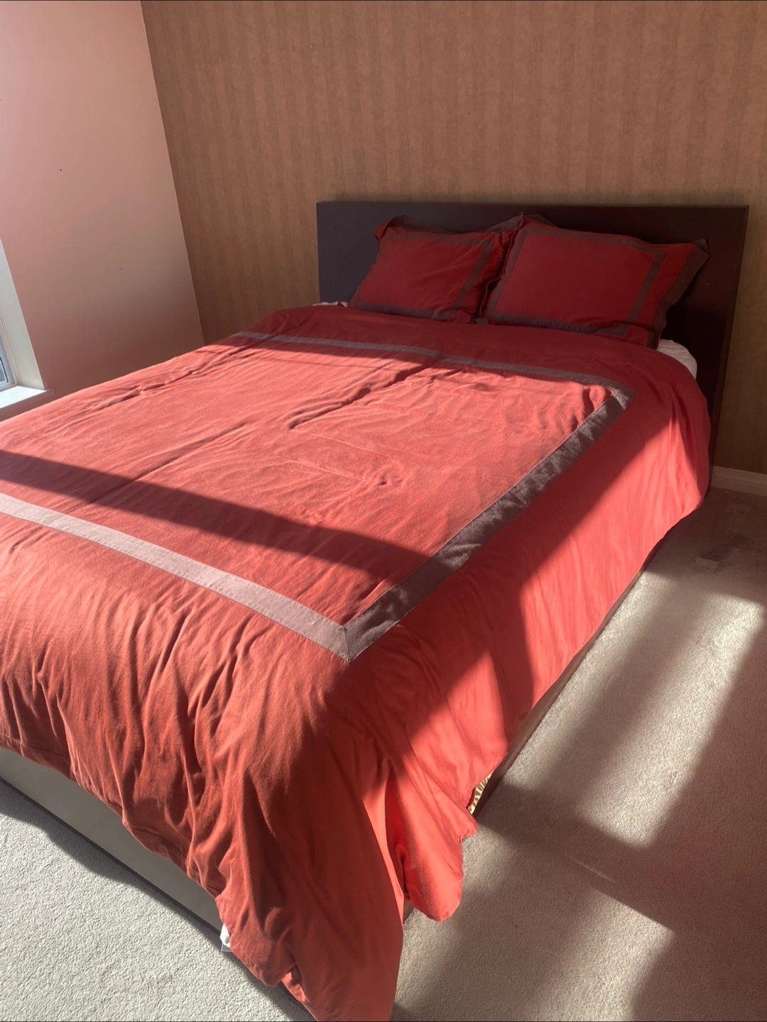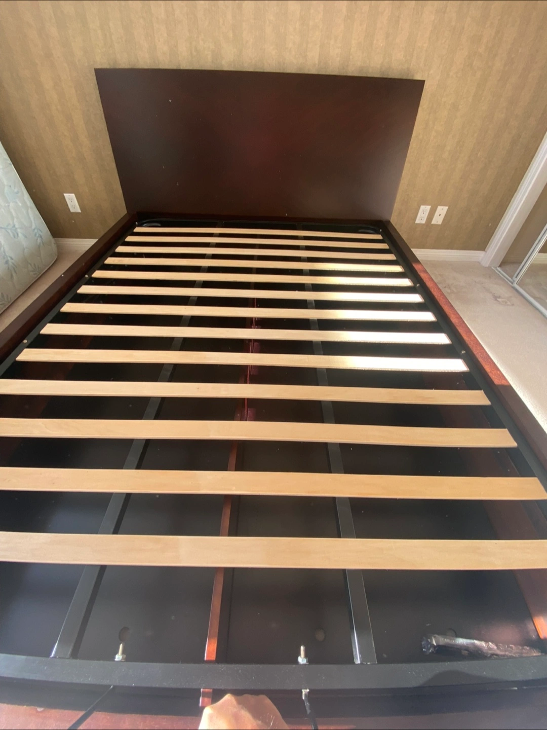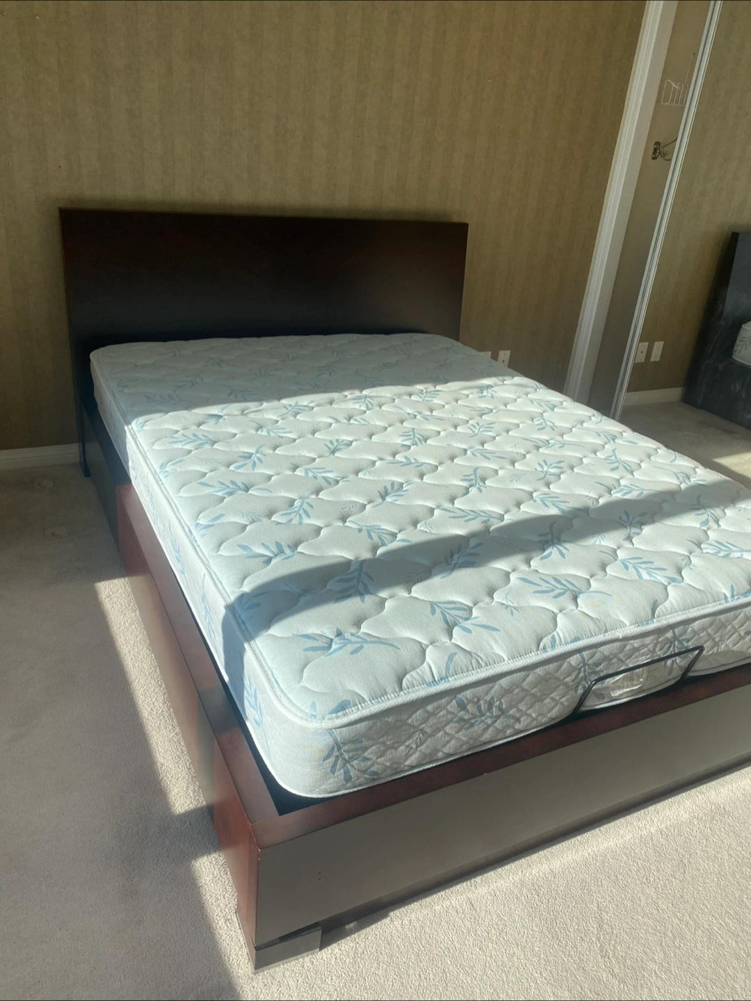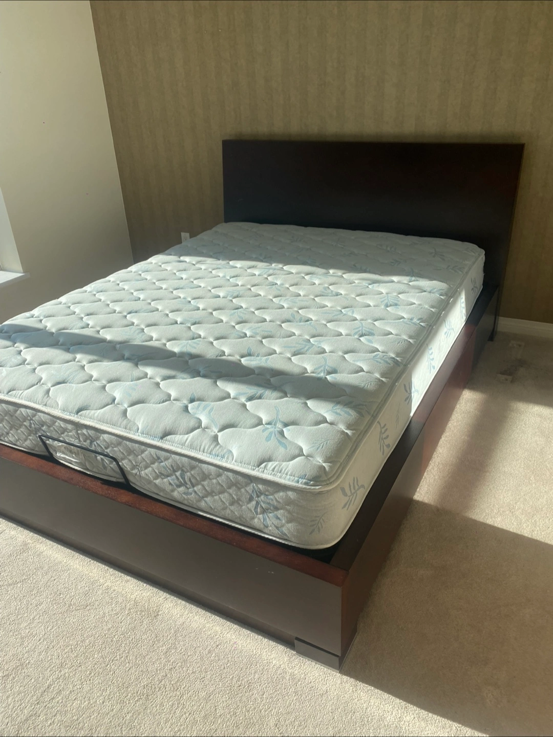 Queen size platform bed frame featuring a dark wood finish and ample under-bed storage. It's designed for modern bedrooms and offers practical storage solutions. The sturdy frame supports your mattress with ease.