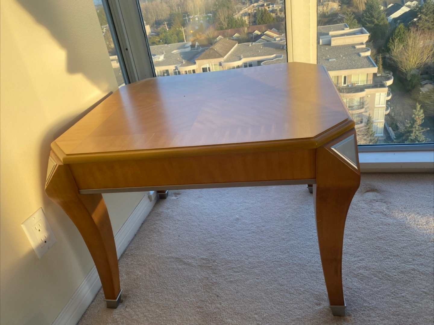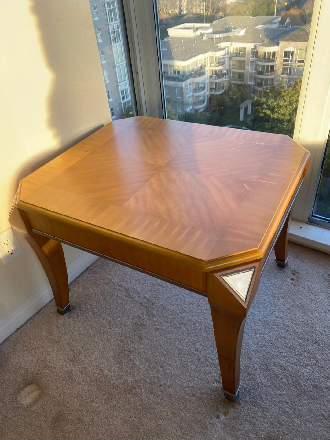 A stylish wooden accent table featuring a patterned tabletop and elegant curved legs with silver detailing. It's perfect for adding a touch of sophistication to any room. The table's compact size makes it versatile for various spaces.