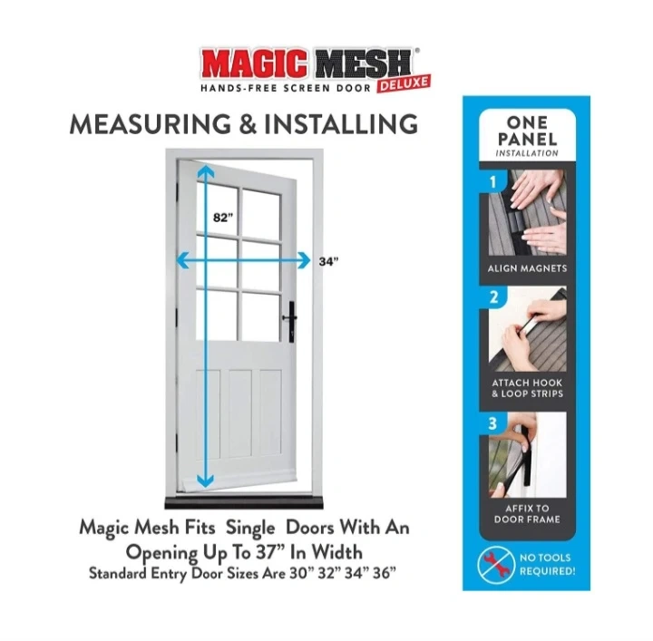 Keep bugs out with this heavy-duty mesh screen door. It features 18 powerful magnets that open and close like magic! Fits single doors and sliding doors up to 39 inches wide.