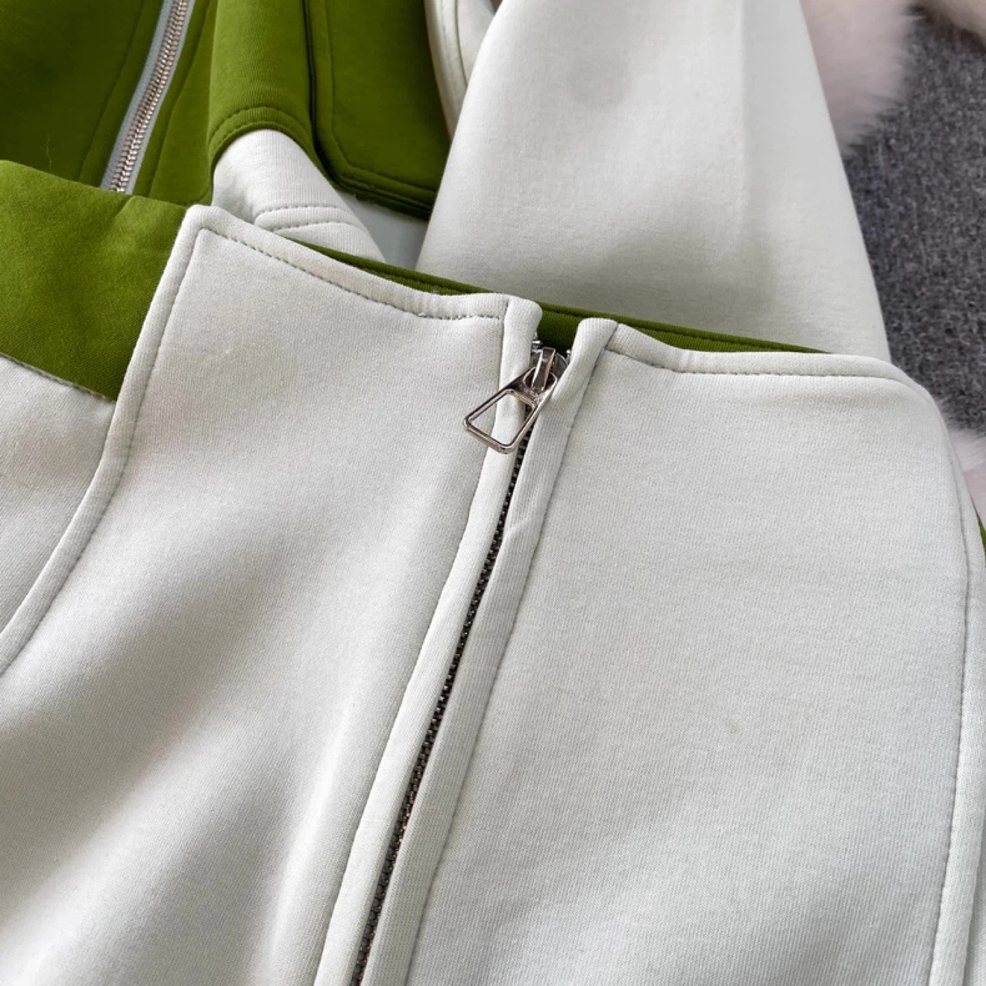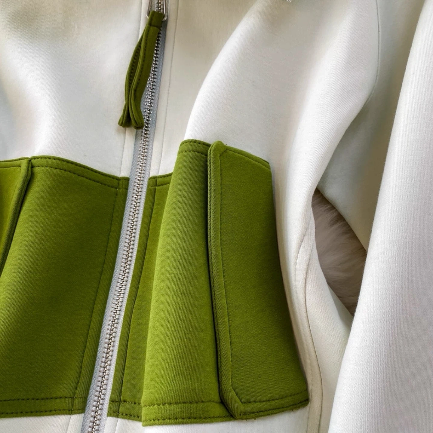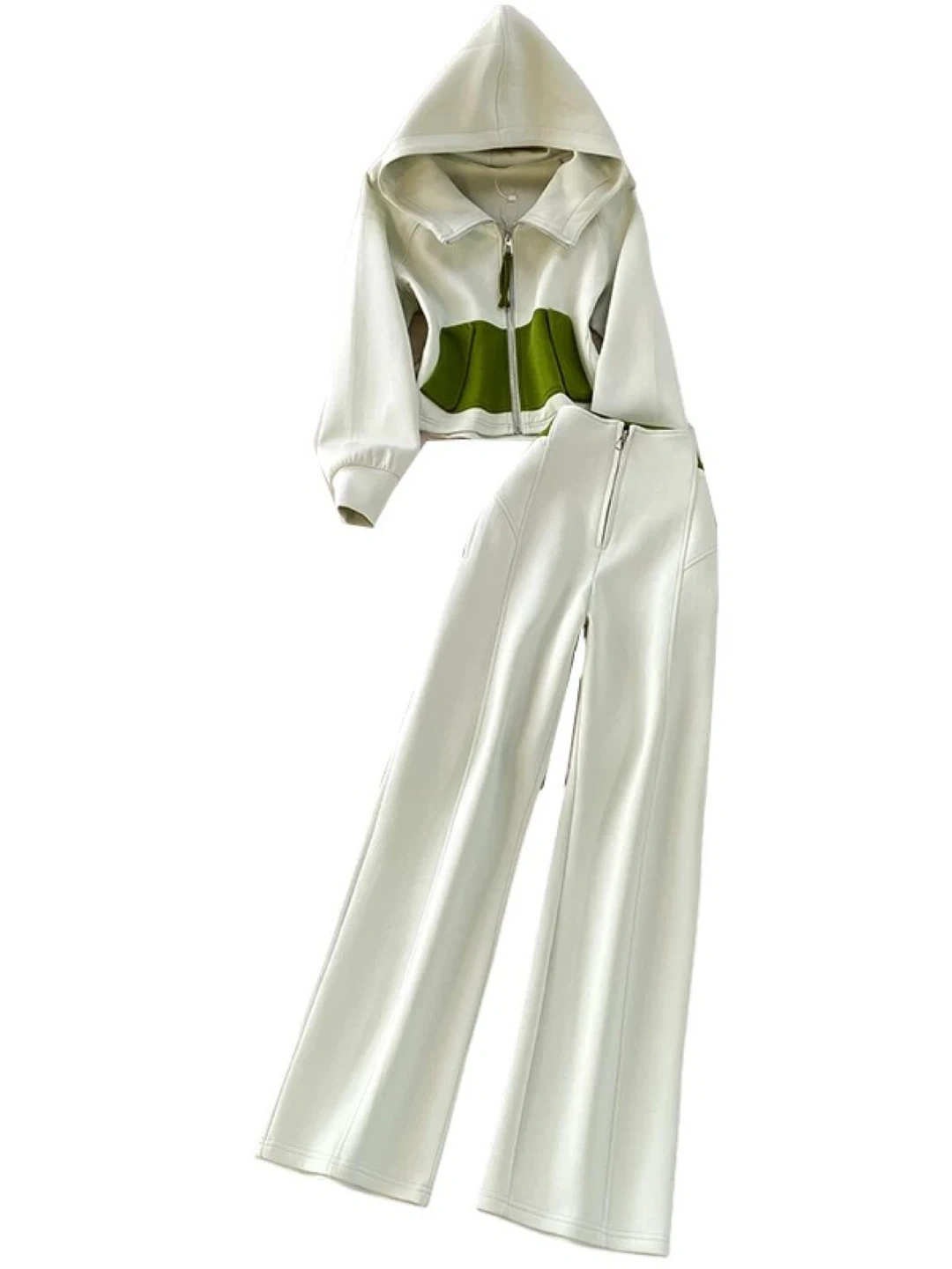 Two-piece tracksuit set featuring a zip-up hoodie and wide-leg pants. The hoodie has a contrast green panel and pocket details. Pants have a zip closure and wide leg.