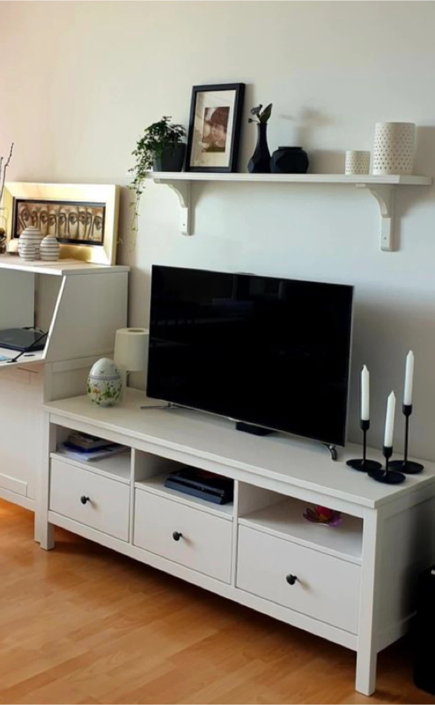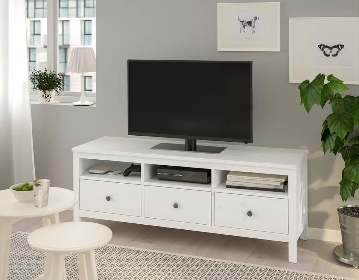 White TV stand featuring three drawers and two open shelves. This unit supports TVs from 26" to 58". Each drawer holds up to 9 kg (20 lbs), and the shelves each support 13 kg (29 lbs). The top surface can hold up to 25 kg (55 lbs). Perfect for organizing media consoles and accessories!
