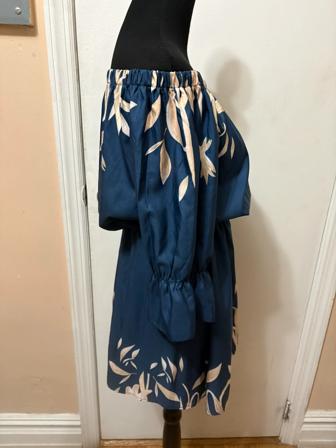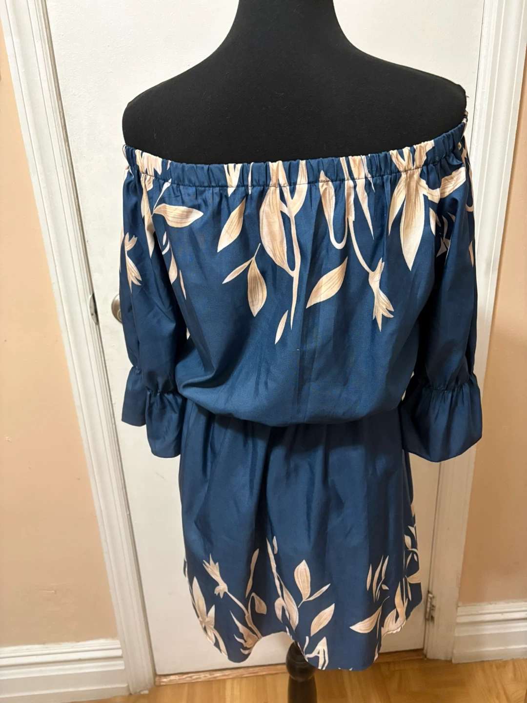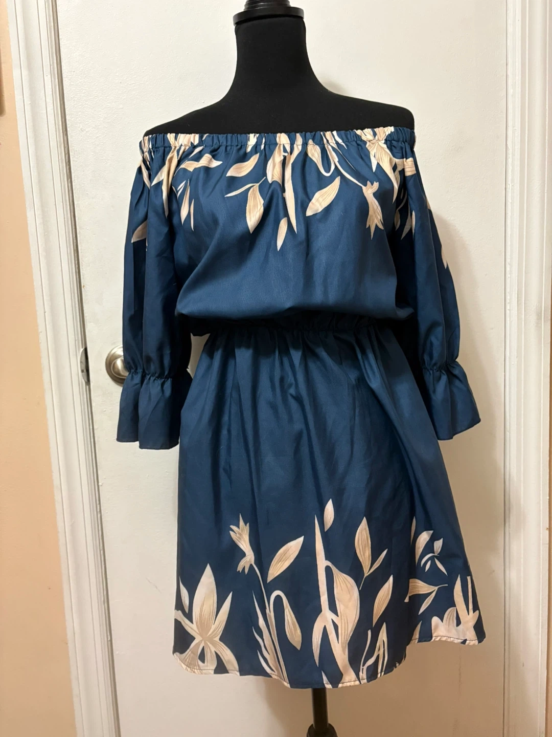 This off-the-shoulder dress features a blue base with a cream-colored floral print. It has an elasticized waistband and ruffled cuffs. The size tag reads S.