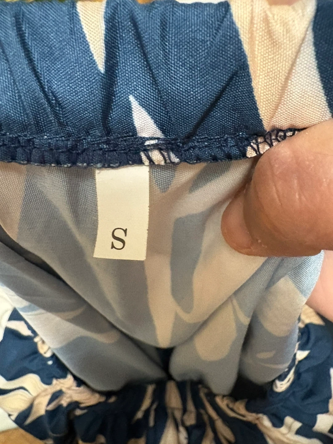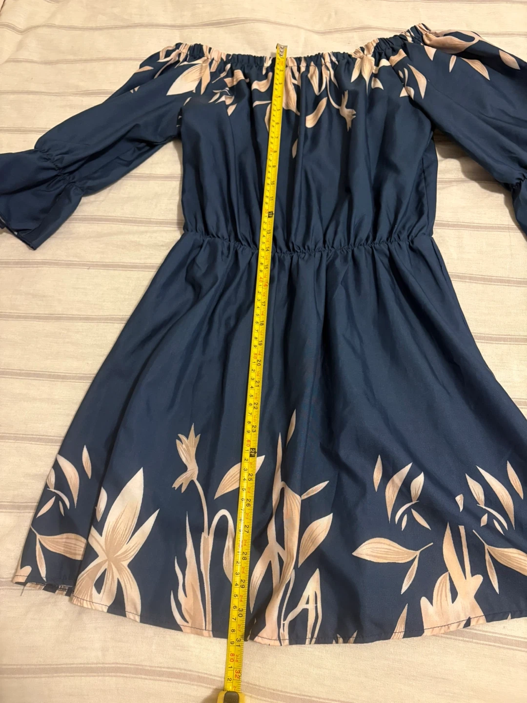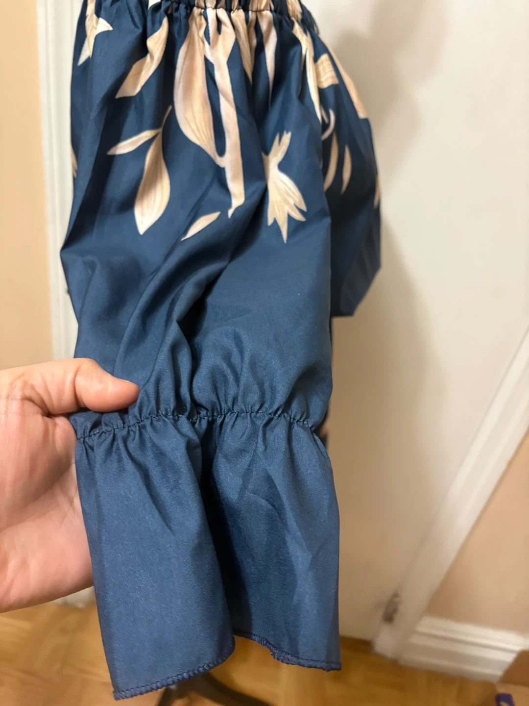This off-the-shoulder dress features a blue base with a cream-colored floral print. It has an elasticized waistband and ruffled cuffs. The size tag reads S.