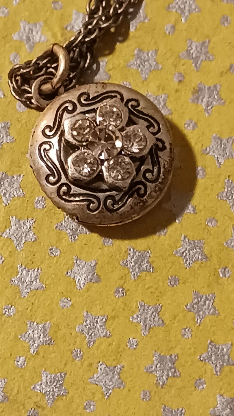 This charming locket necklace features a floral design accented with sparkling rhinestones. It hangs on a delicate silver - toned chain. A lovely accessory for any occasion! American Eagle!