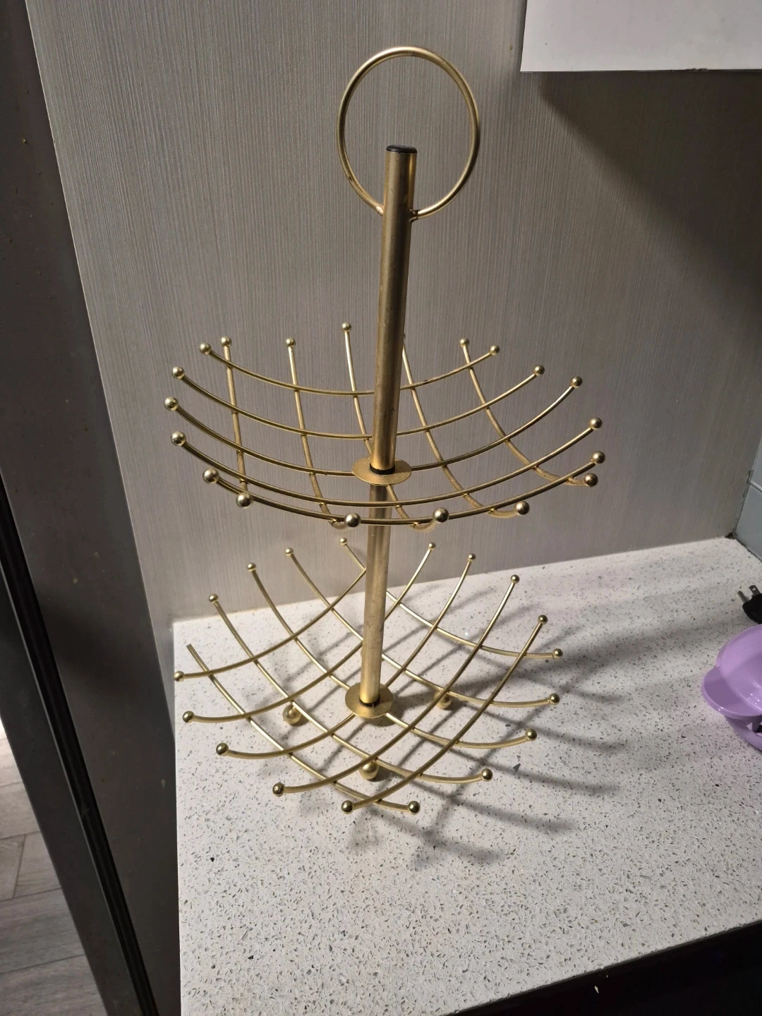 A stylish two-tier fruit bowl stand in a gold finish. It's designed to hold fruits or other small kitchen items. This stand would look great on a countertop or table!