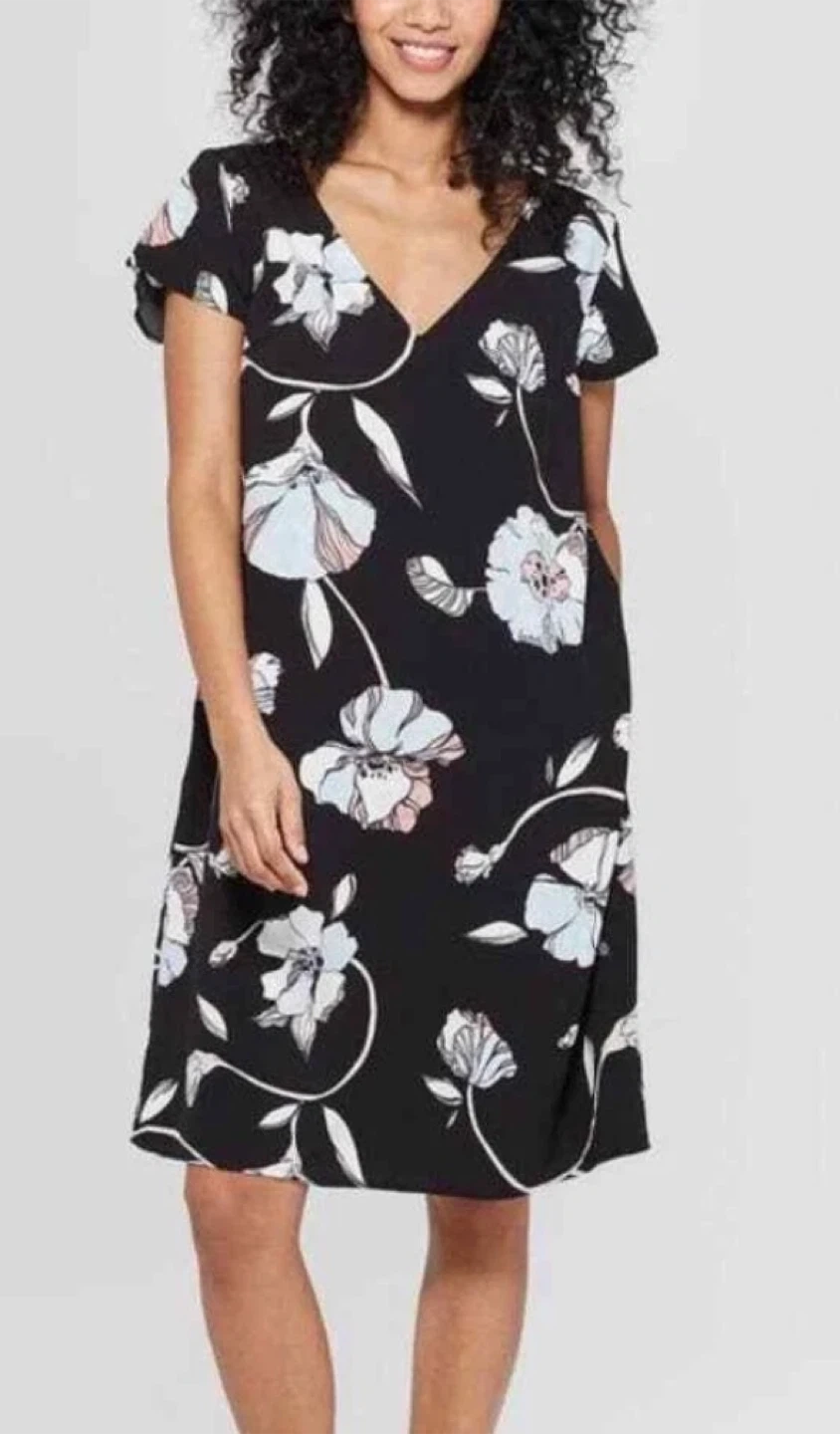 This A New Day dress features a black background with a colorful floral print. It has a flattering V-neckline and short sleeves. Made in China. Size L.