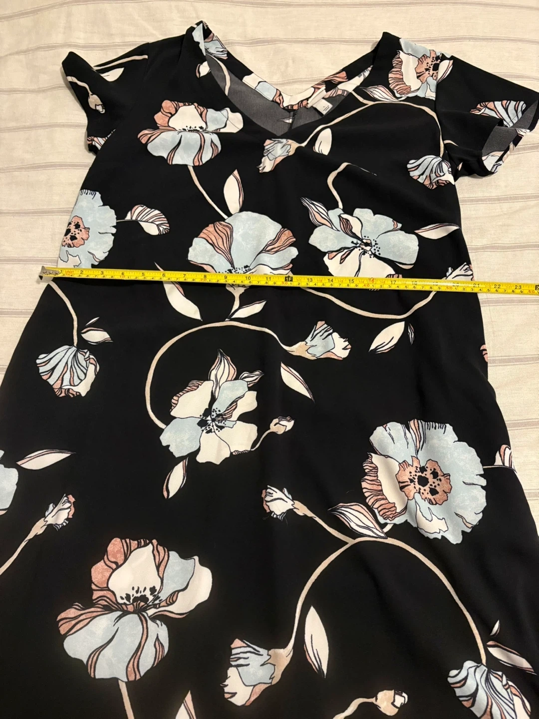 This A New Day dress features a black background with a colorful floral print. It has a flattering V-neckline and short sleeves. Made in China. Size L.