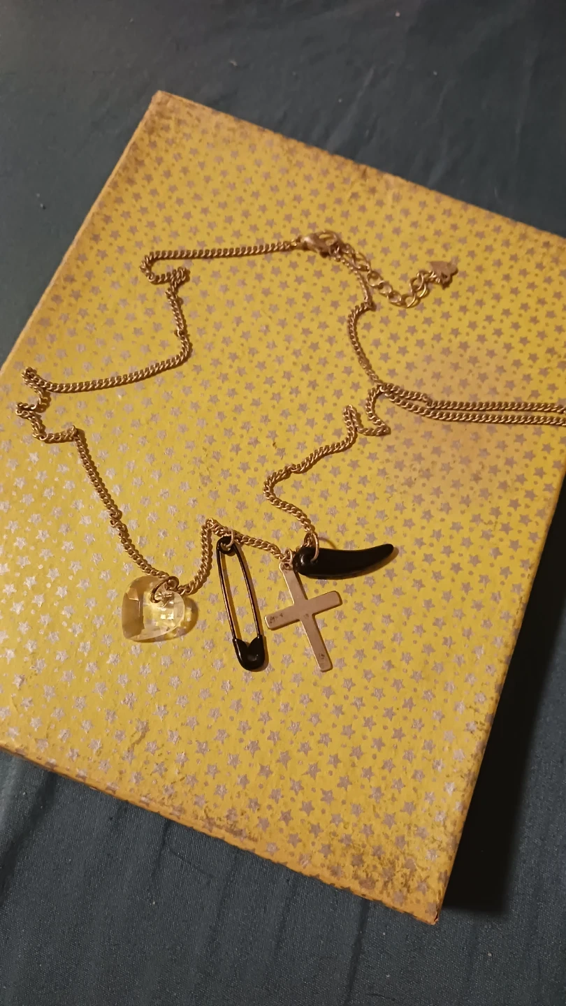Silver-tone necklace with multiple charms including a clear heart, black safety pin, cross, and a black fang. Features an adjustable chain for custom fit. This necklace adds a unique touch to any outfit!