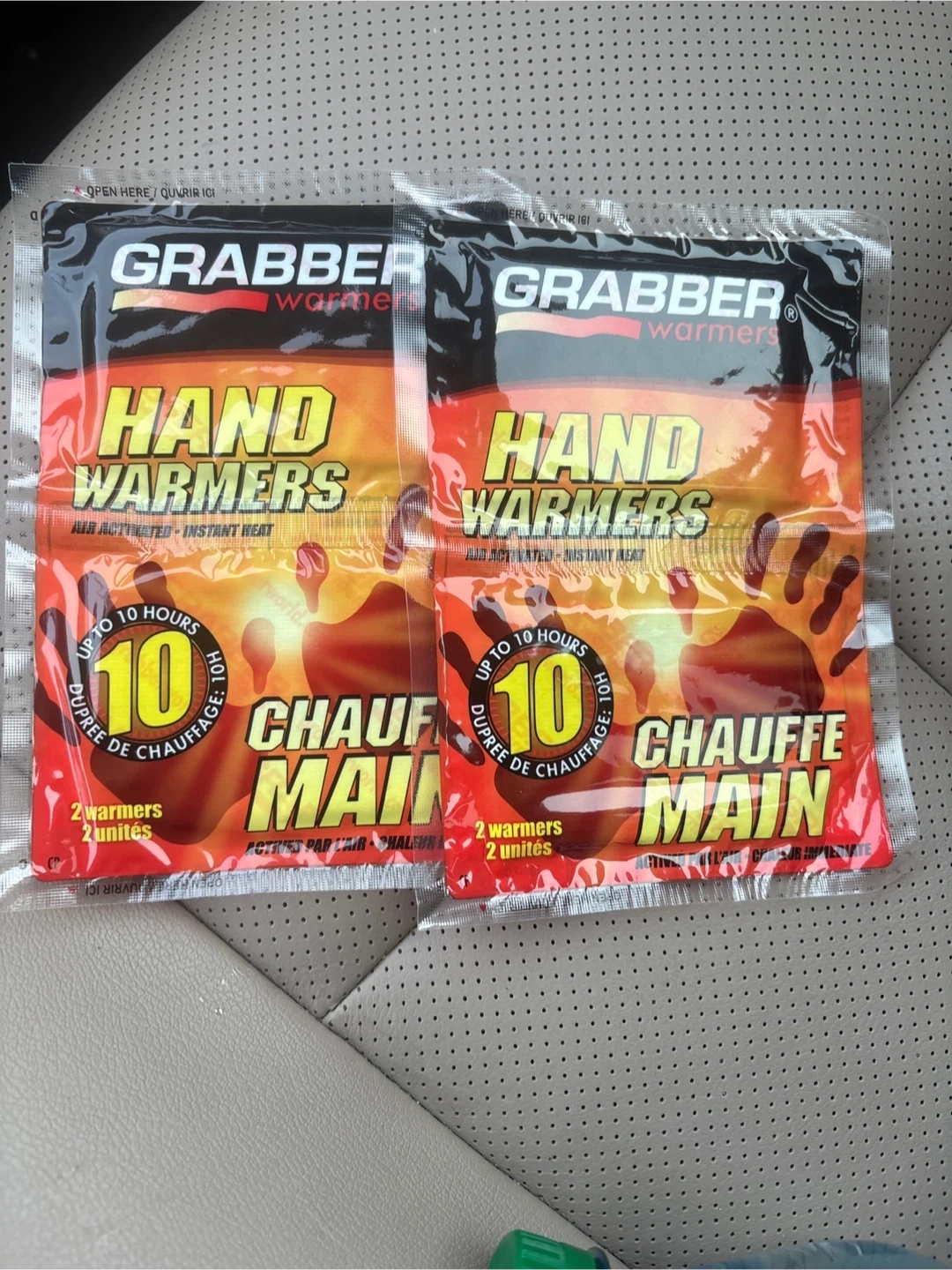 Two pairs of Grabber hand warmers included. They're air-activated for instant heat and last up to 10 hours. Perfect for keeping your hands warm outdoors!