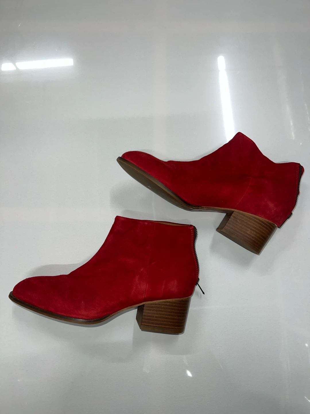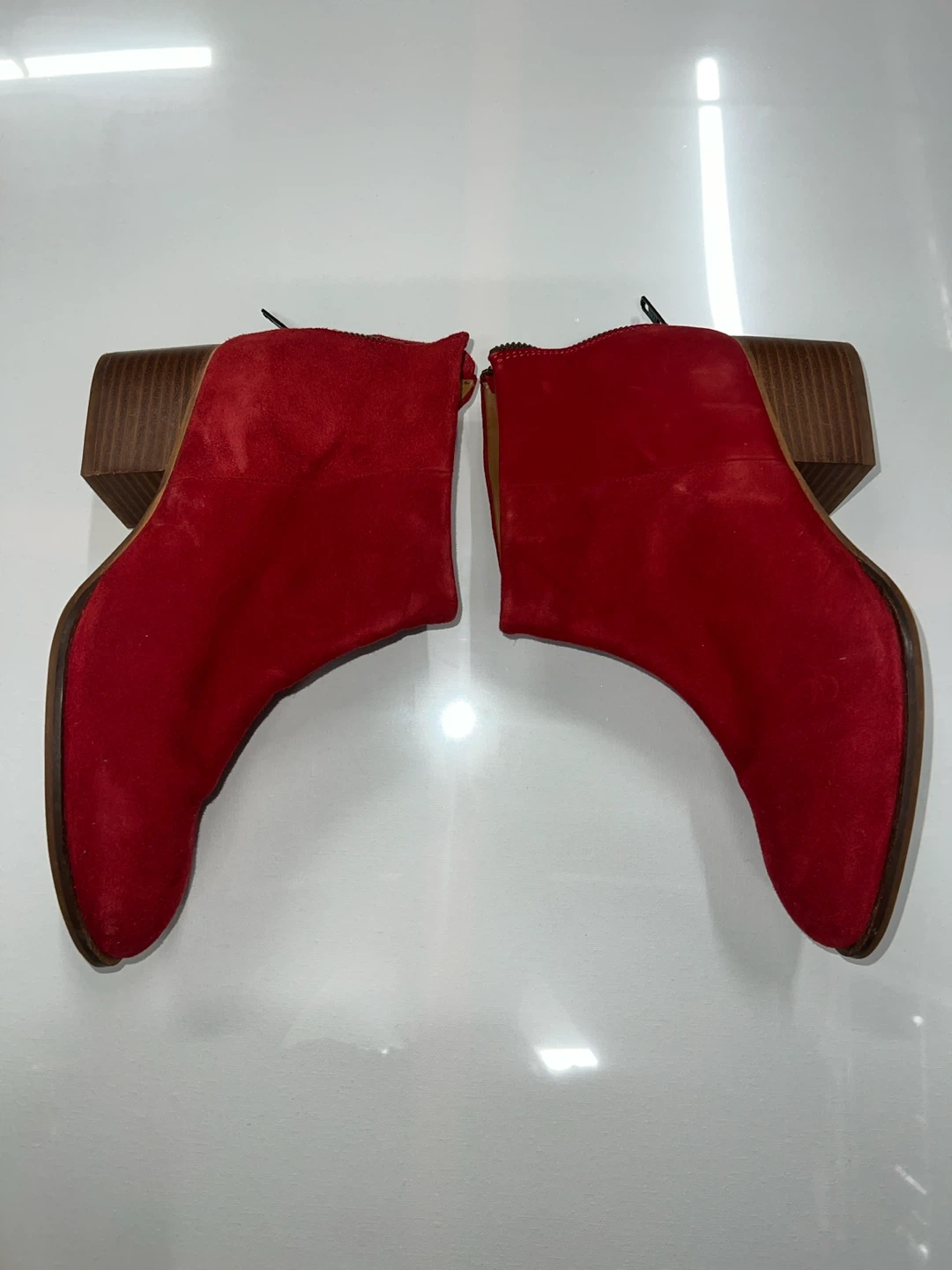 These red suede ankle boots feature a convenient side zipper. They have a stacked wooden heel, giving them a stylish look. Perfect for adding a pop of color to any outfit!