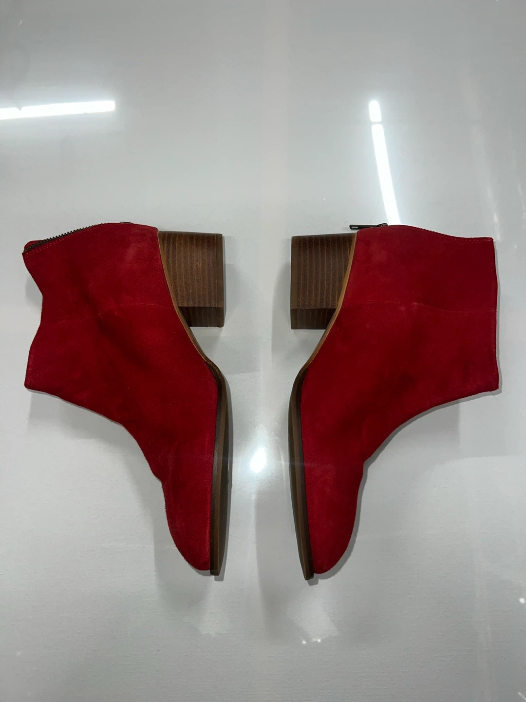 These red suede ankle boots feature a convenient side zipper. They have a stacked wooden heel, giving them a stylish look. Perfect for adding a pop of color to any outfit!