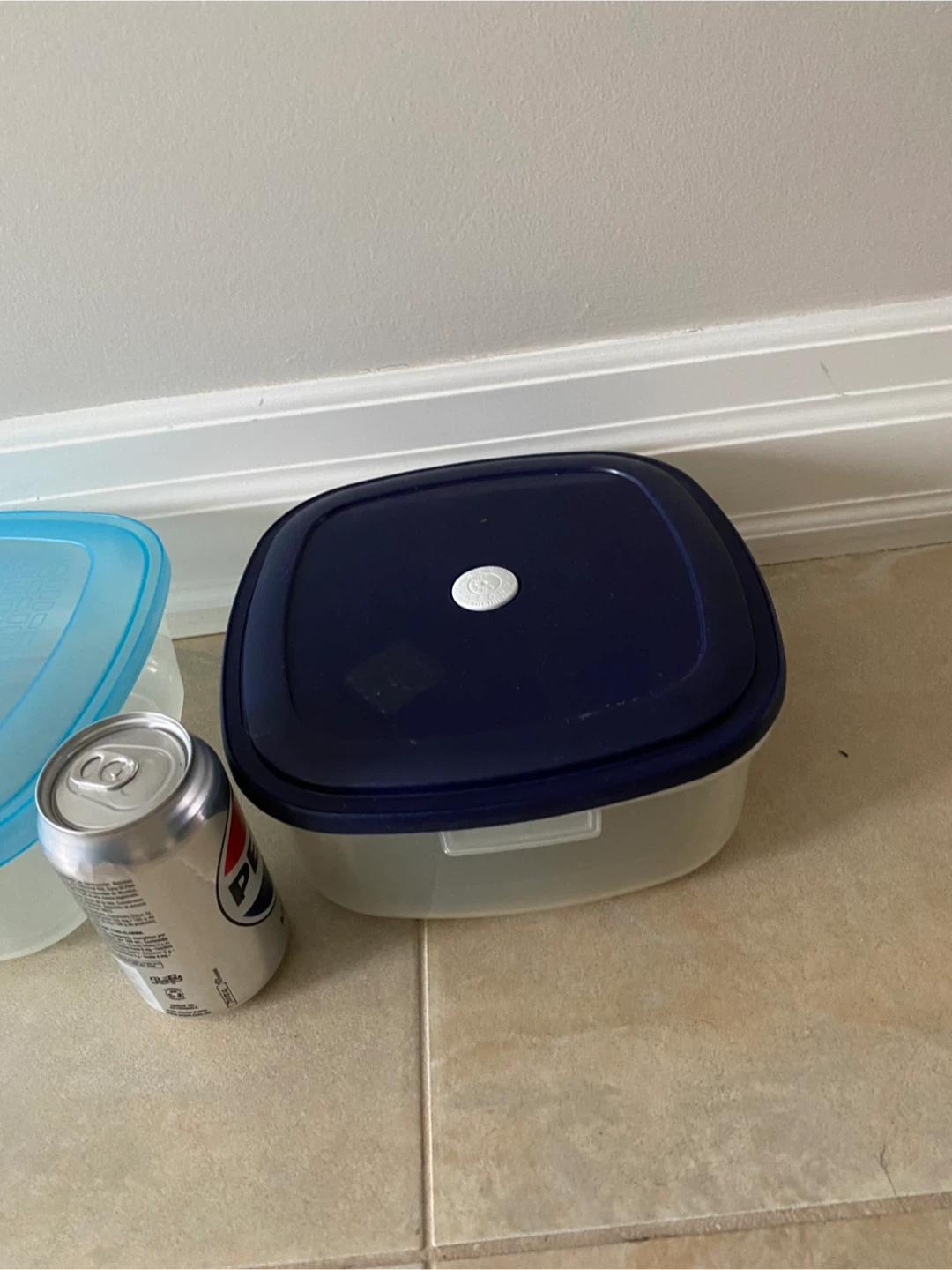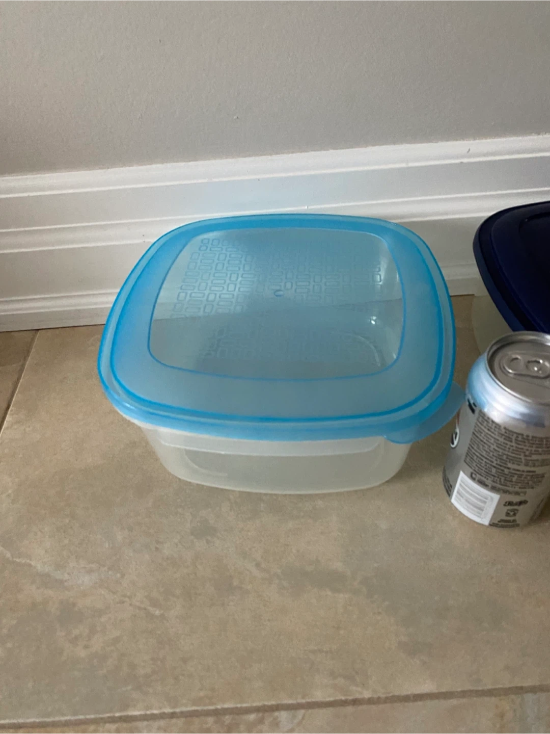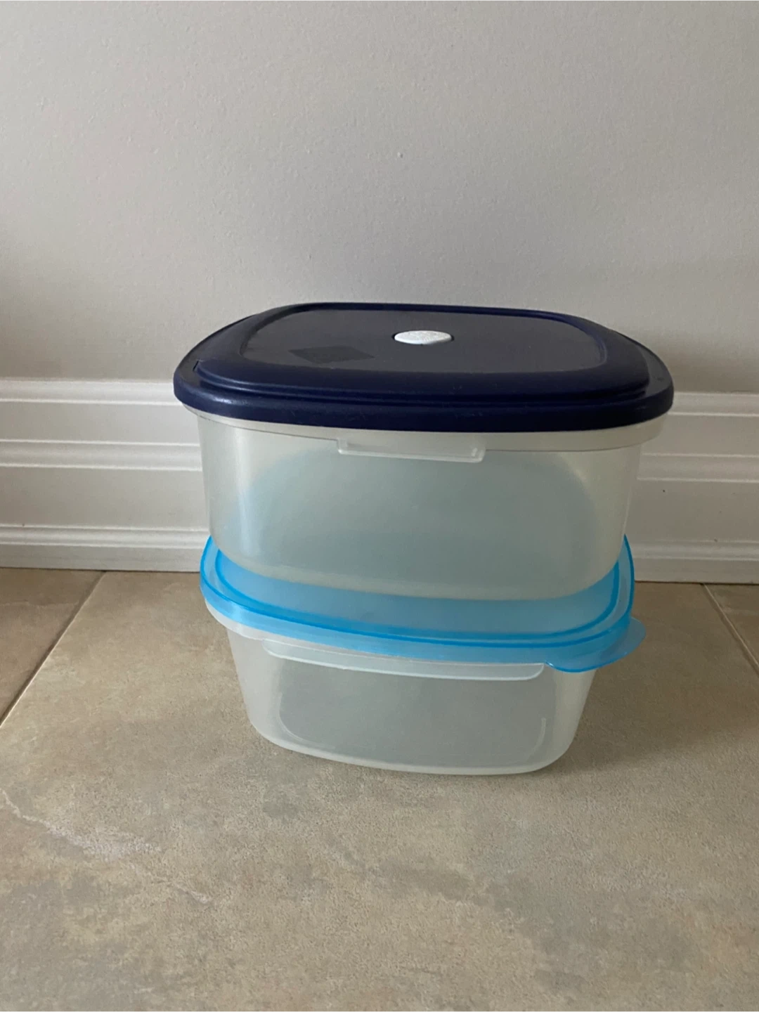 Two plastic food storage containers with lids. One has a light blue lid, the other has a dark blue lid. They're useful for meal prepping or storing leftovers.