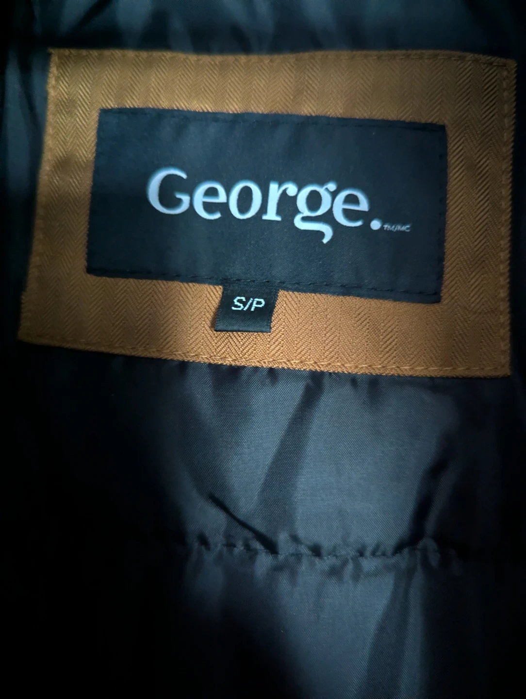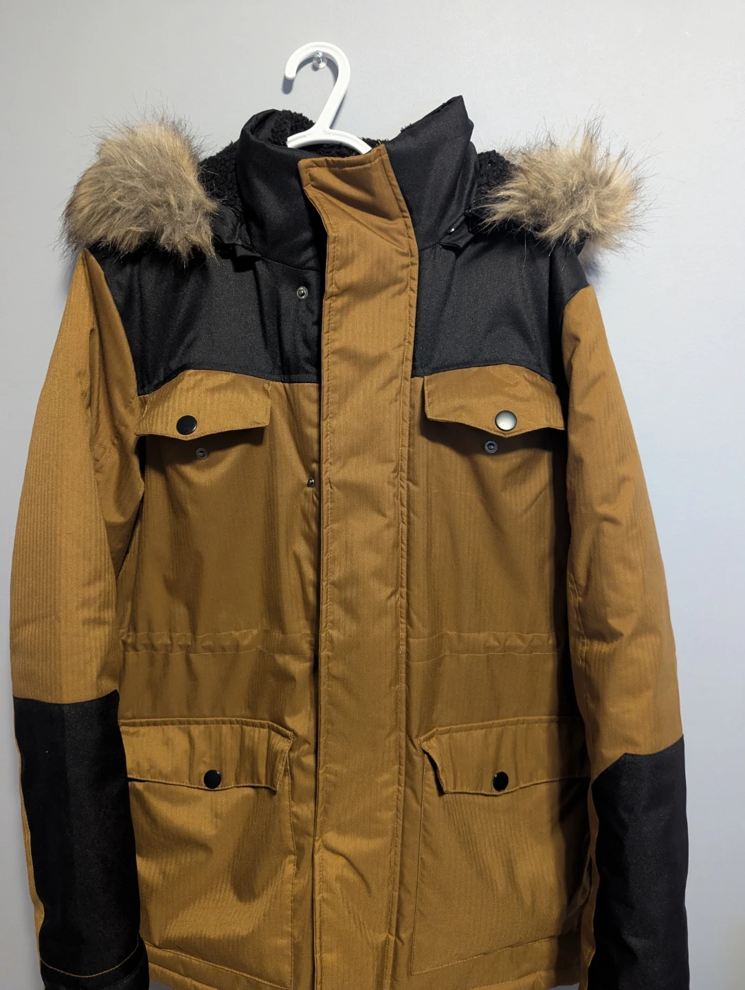 This George. parka jacket is brown with black accents and a faux fur-lined hood. It features multiple front pockets and a drawstring waist. Size is S/P.