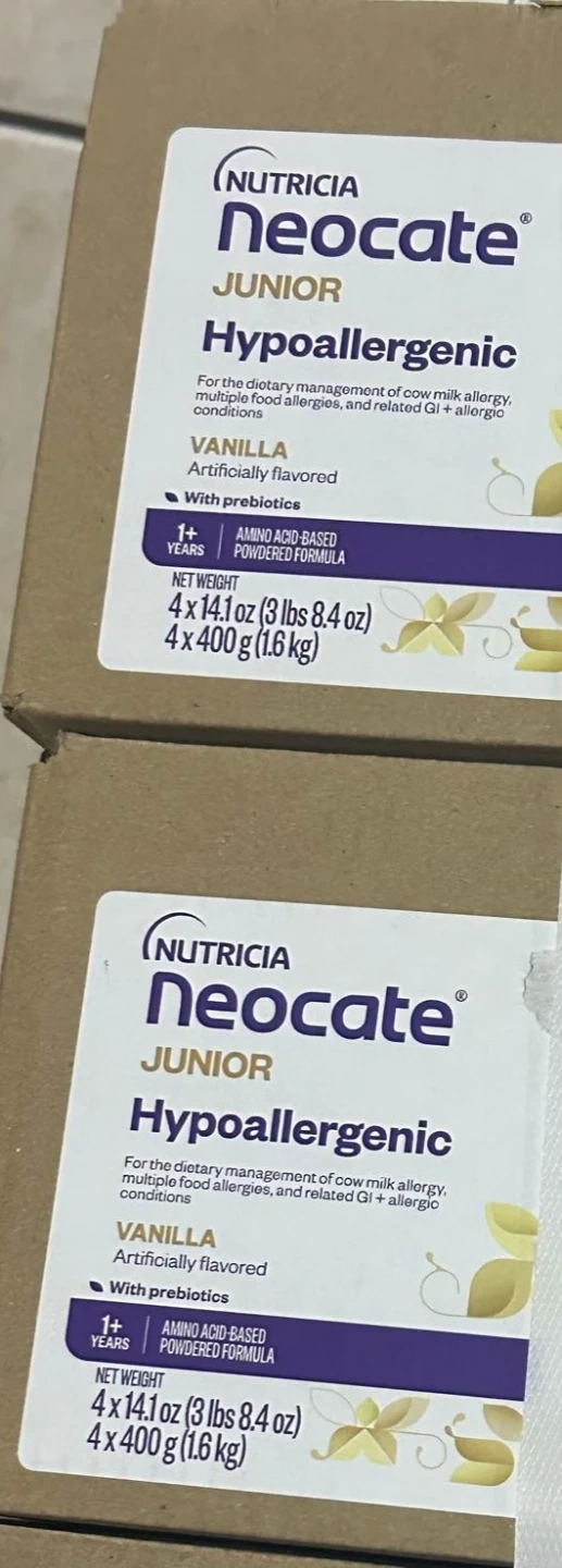 This is Nutricia Neocate Junior, a hypoallergenic formula. It's artificially flavored vanilla and contains prebiotics. For dietary management of cow milk allergy, multiple food allergies, and related GI + allergic conditions. Amino acid-based powdered formula.