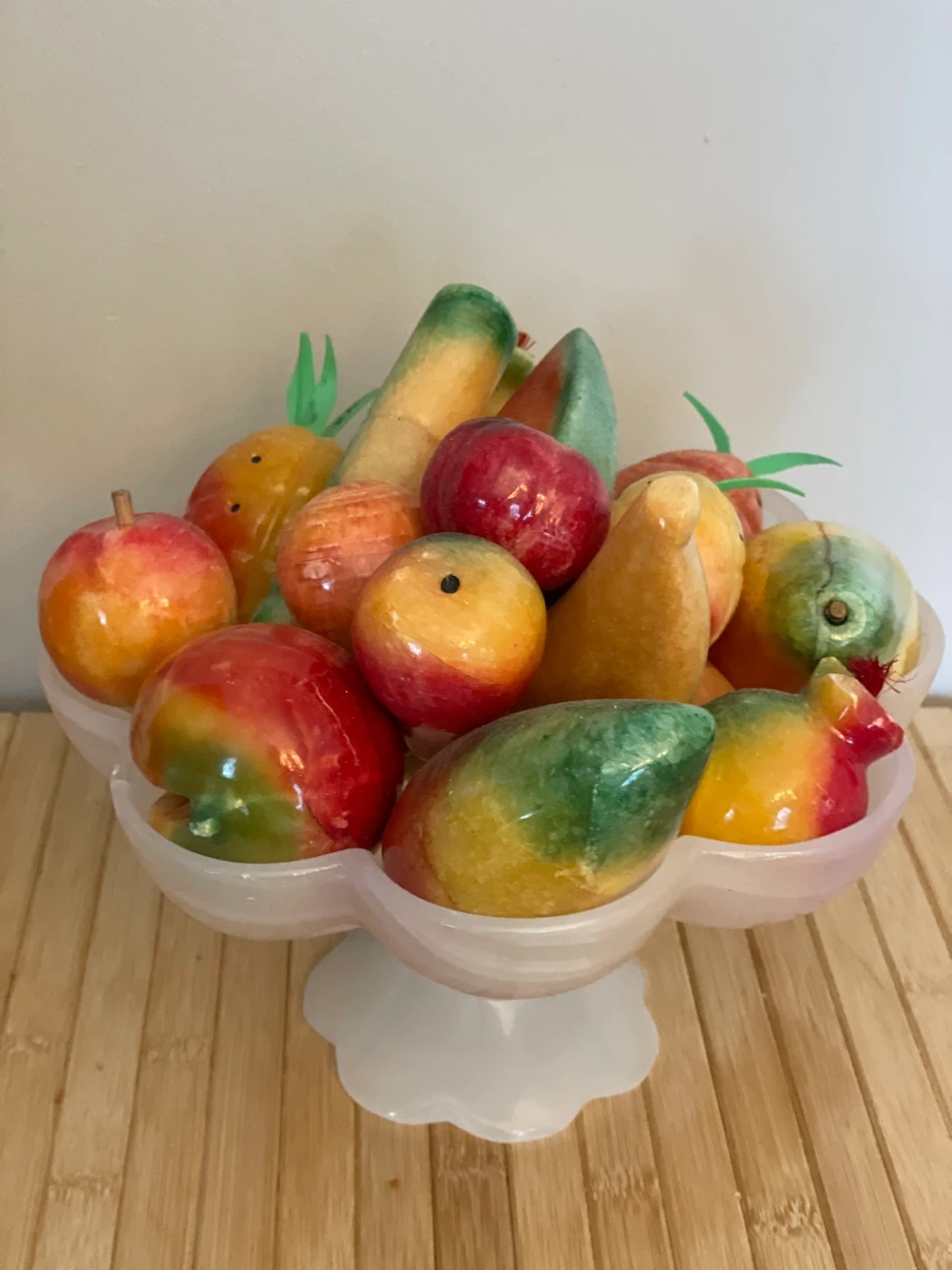 This decorative bowl is filled with assorted faux stone fruits. It's a lovely piece for display. The fruits are carved from polished stone, resembling apples, mangoes, and other produce.