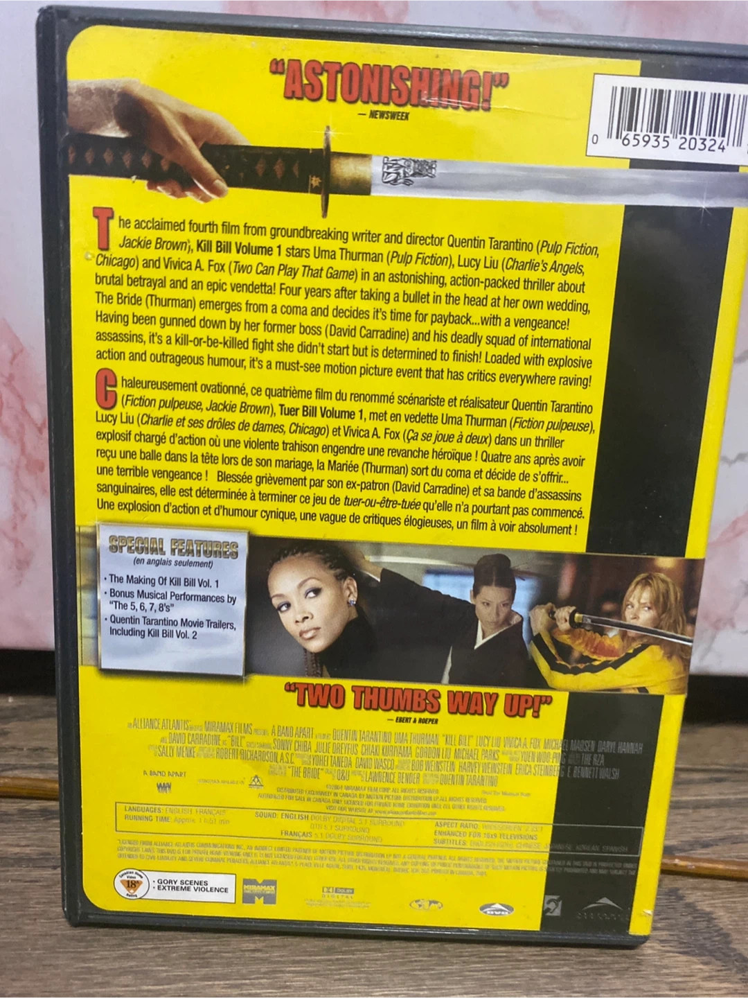 Selling a DVD copy of Kill Bill: Volume 1, the 4th film by Quentin Tarantino! This action-packed movie stars Uma Thurman, Lucy Liu, and Vivica A. Fox. Get ready for a thrilling ride full of revenge and explosive action!