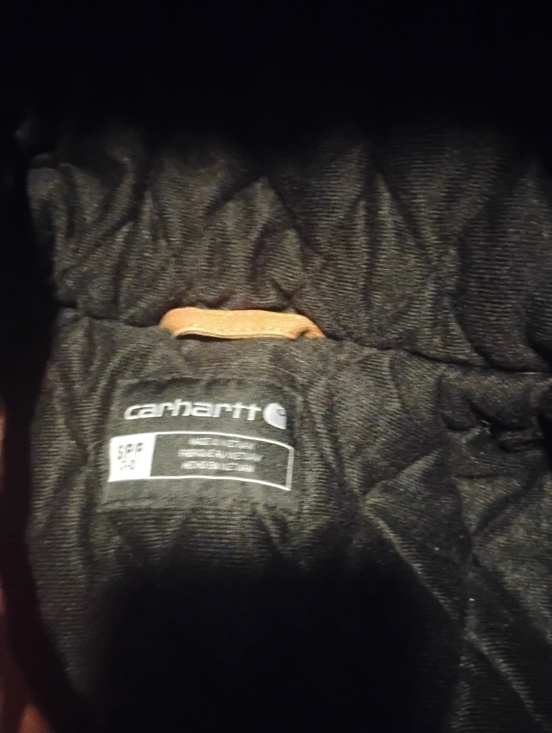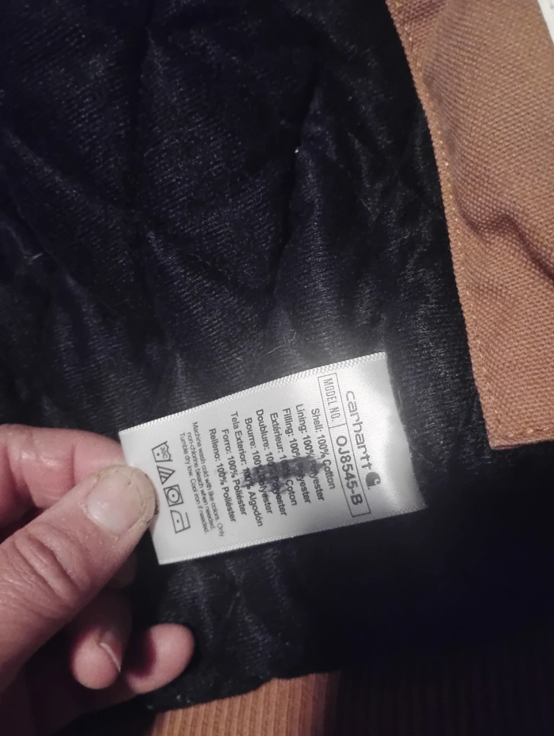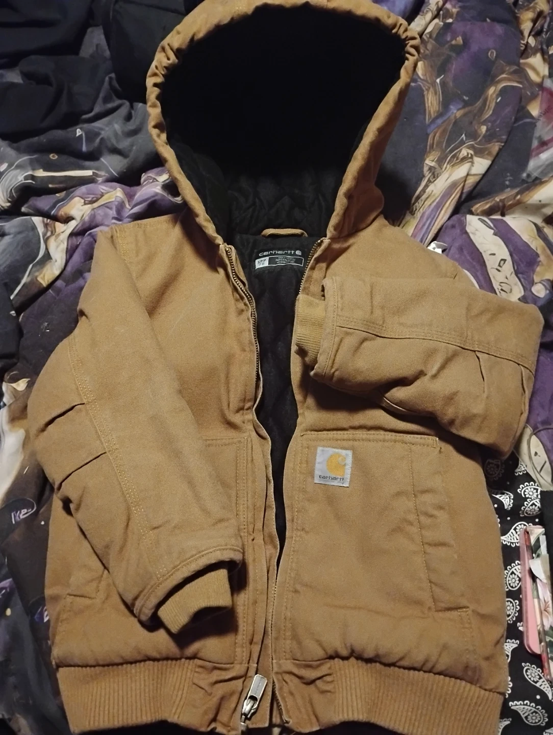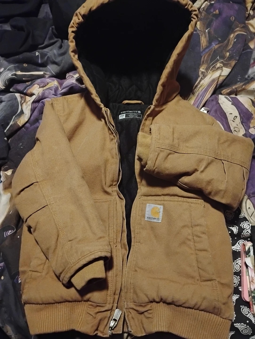 This Carhartt jacket is insulated for warmth and features a durable cotton shell. It has a polyester lining and a hood. It's a size S/P, which fits ages 2 to 4. Perfect for keeping kids warm during colder weather!