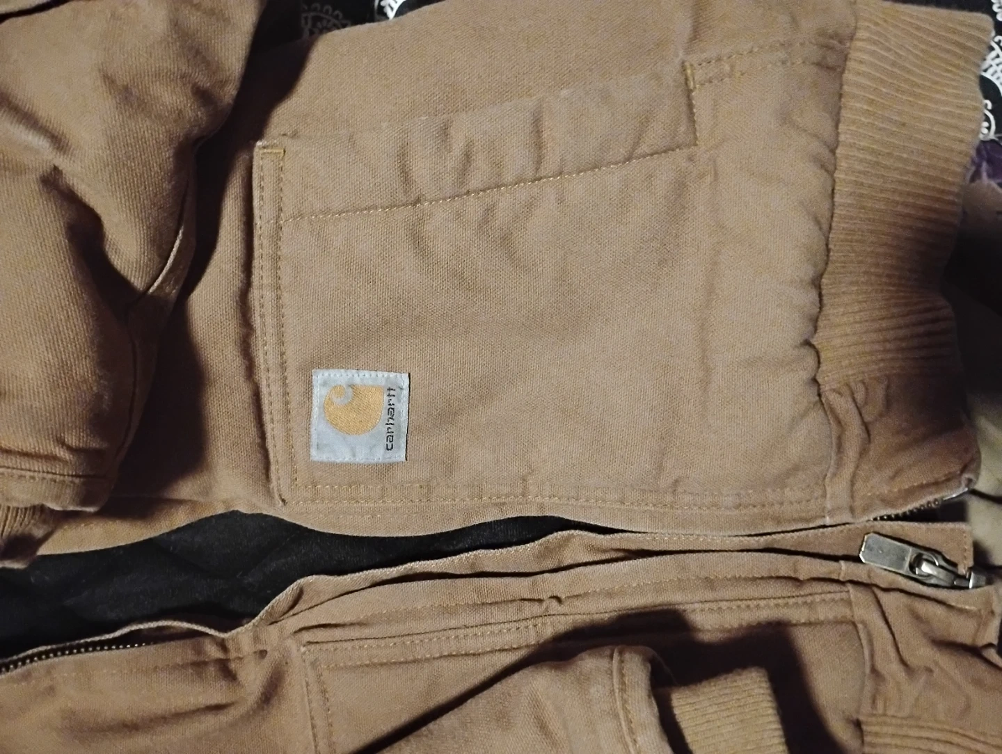 This Carhartt jacket is insulated for warmth and features a durable cotton shell. It has a polyester lining and a hood. It's a size S/P, which fits ages 2 to 4. Perfect for keeping kids warm during colder weather!
