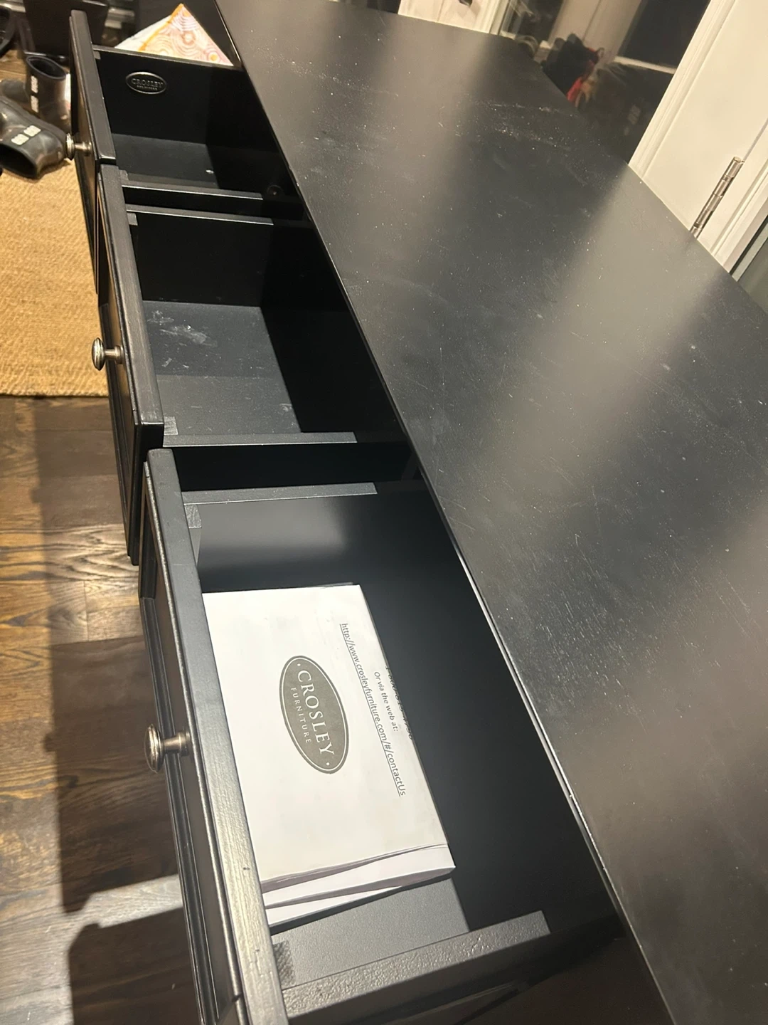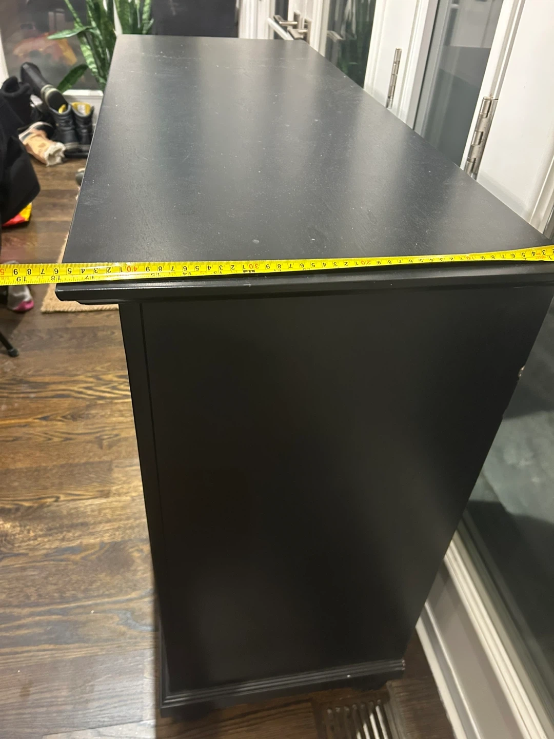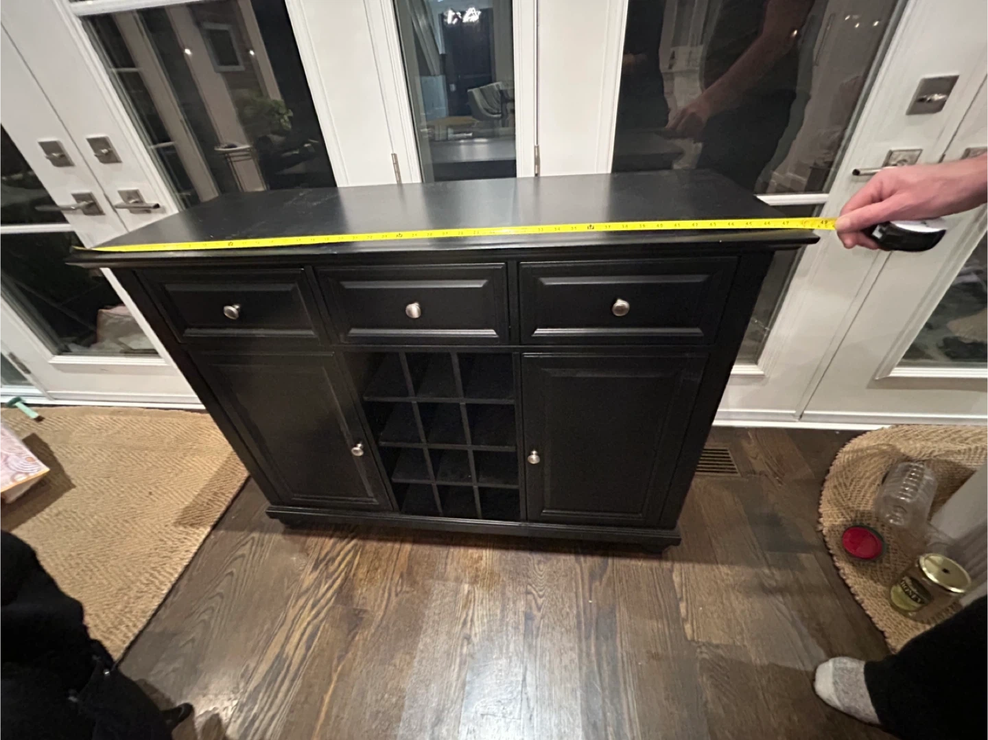 Black buffet server with wine storage. It has three drawers and two cabinets. Dimensions are approximately 46 inches wide and 35 inches tall. This cabinet offers ample storage and display space.