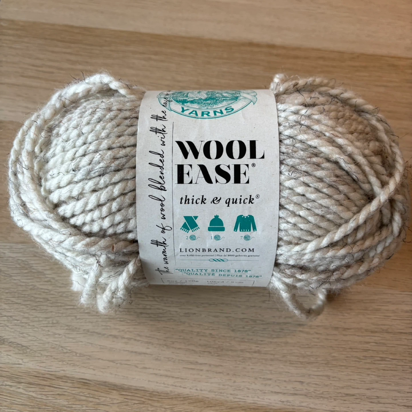 Lion Brand Wool Ease Thick & Quick yarn. This is a thick and quick yarn, blended with wool for warmth. It's great for larger projects like blankets and sweaters! Available in a speckled off-white colour.