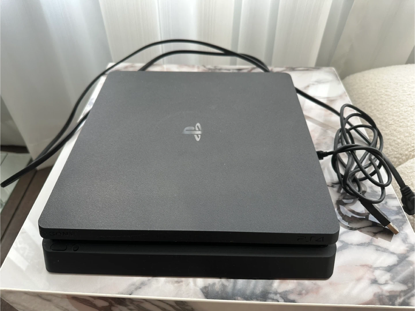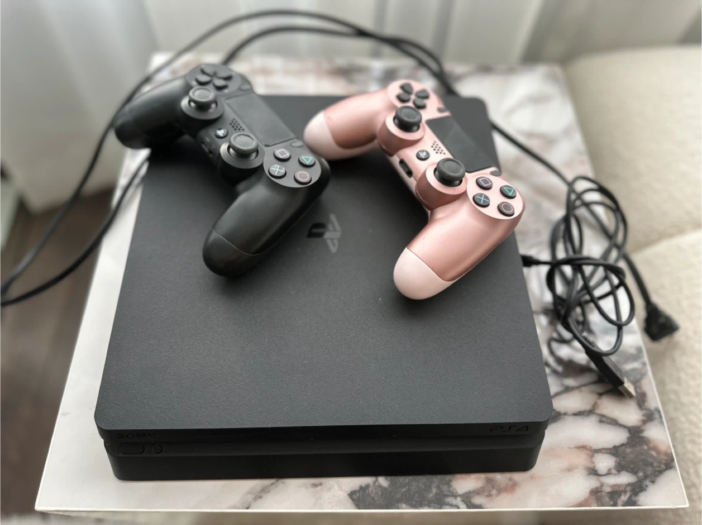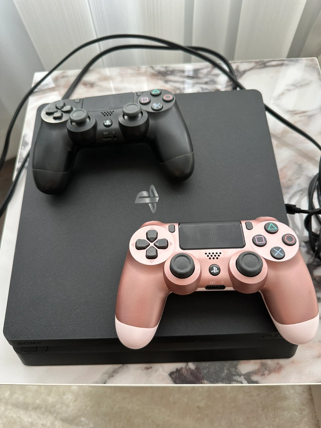 This is a PlayStation 4 Slim console. It comes with two DualShock 4 controllers: one black and one rose gold. It's ready for gaming adventures!