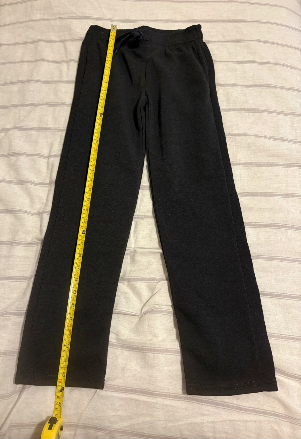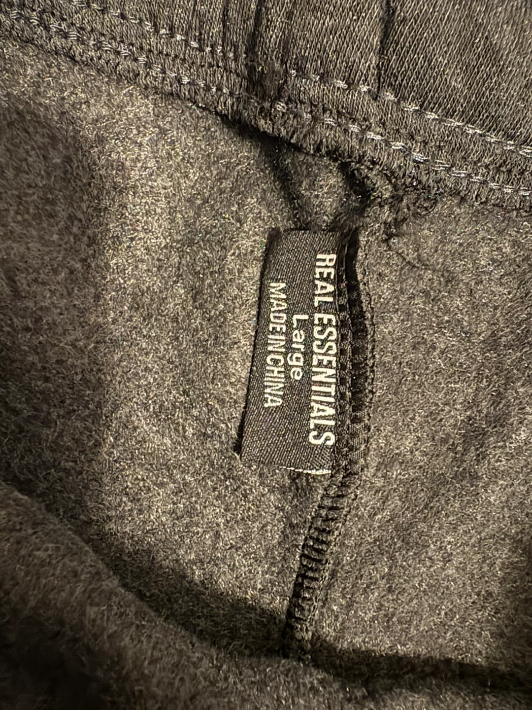 These Real Essentials sweatpants are charcoal grey and size large. They're made from a soft, comfortable material. The waistband has a drawstring for an adjustable fit.