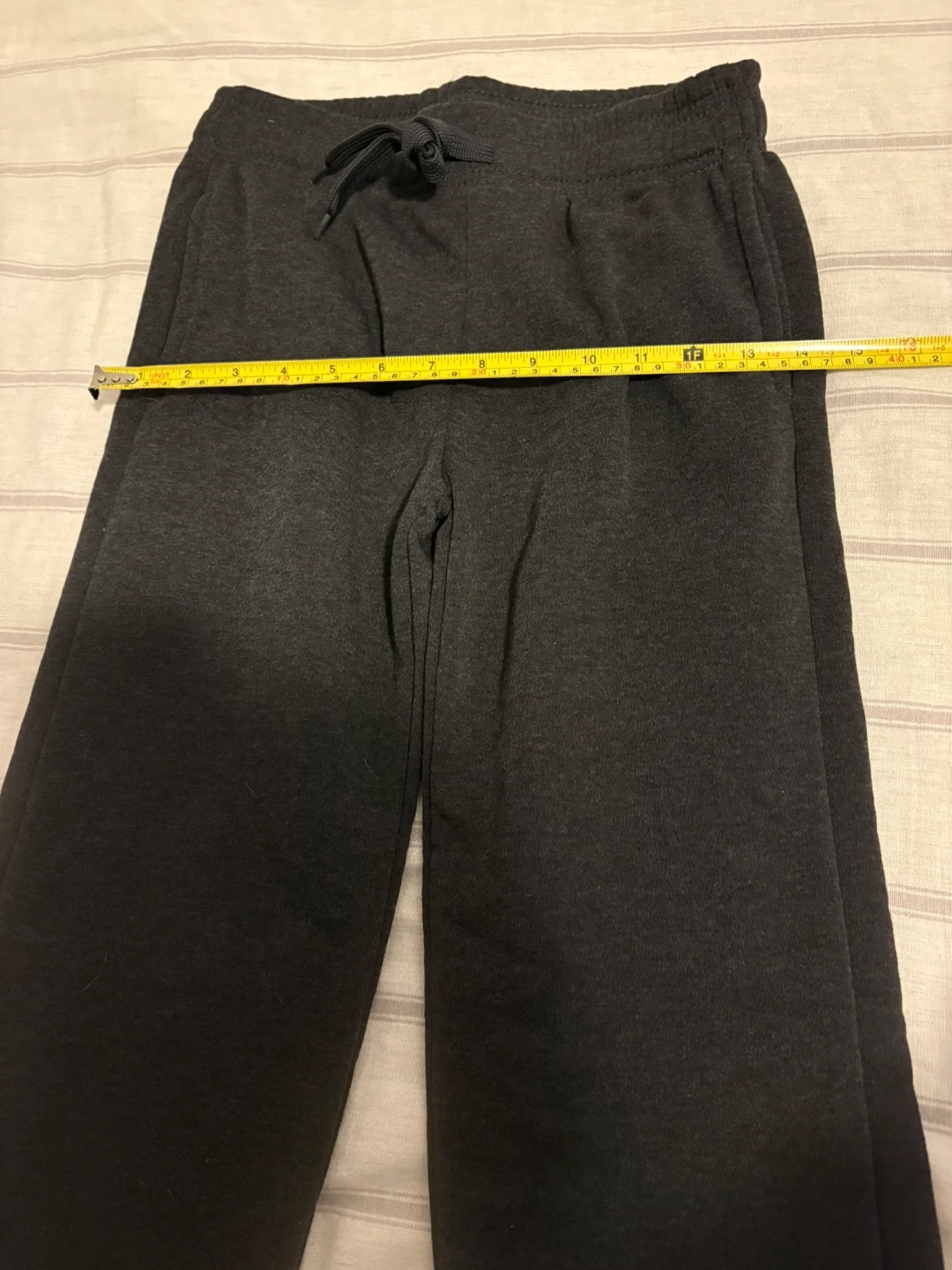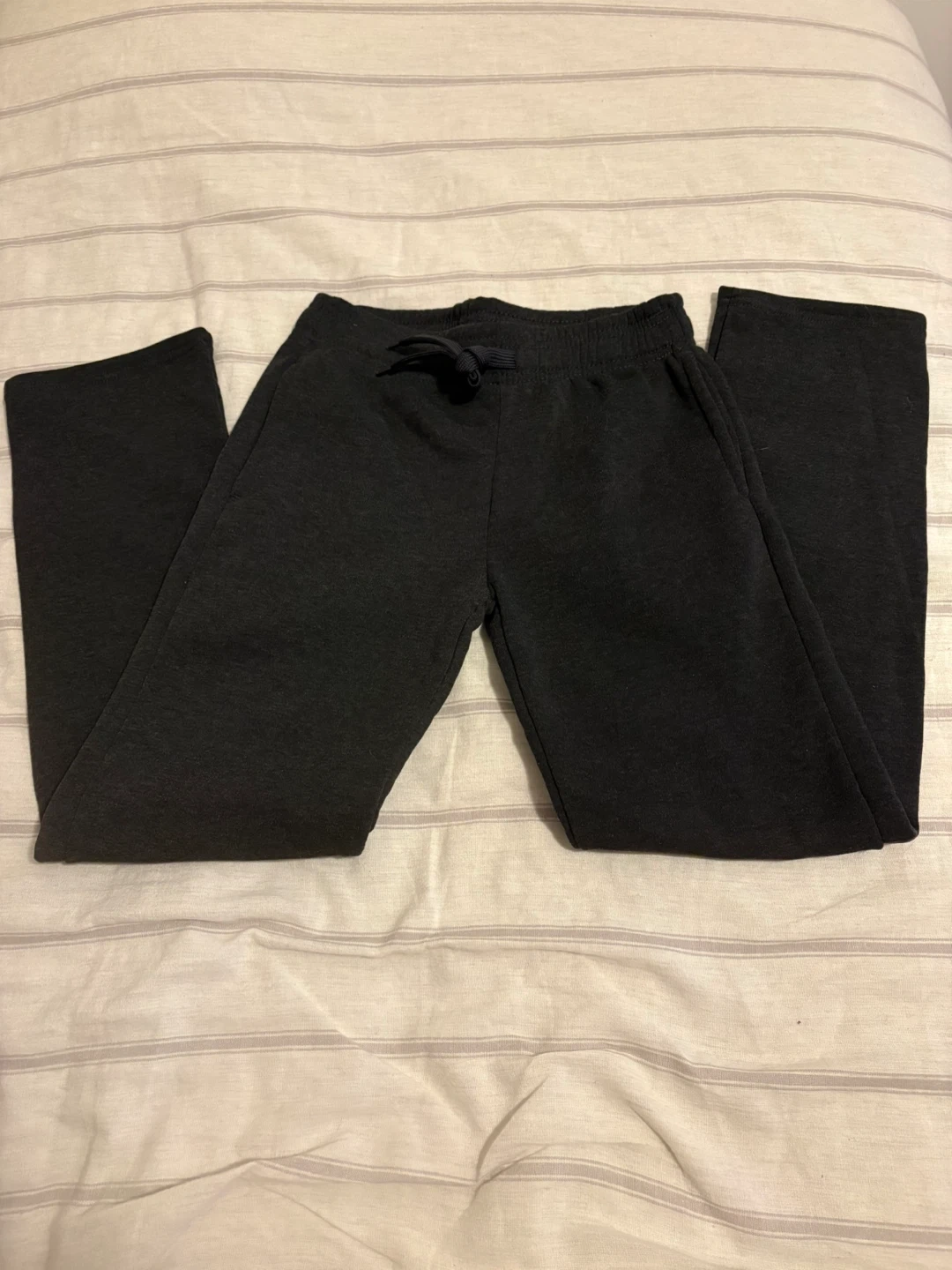 These Real Essentials sweatpants are charcoal grey and size large. They're made from a soft, comfortable material. The waistband has a drawstring for an adjustable fit.