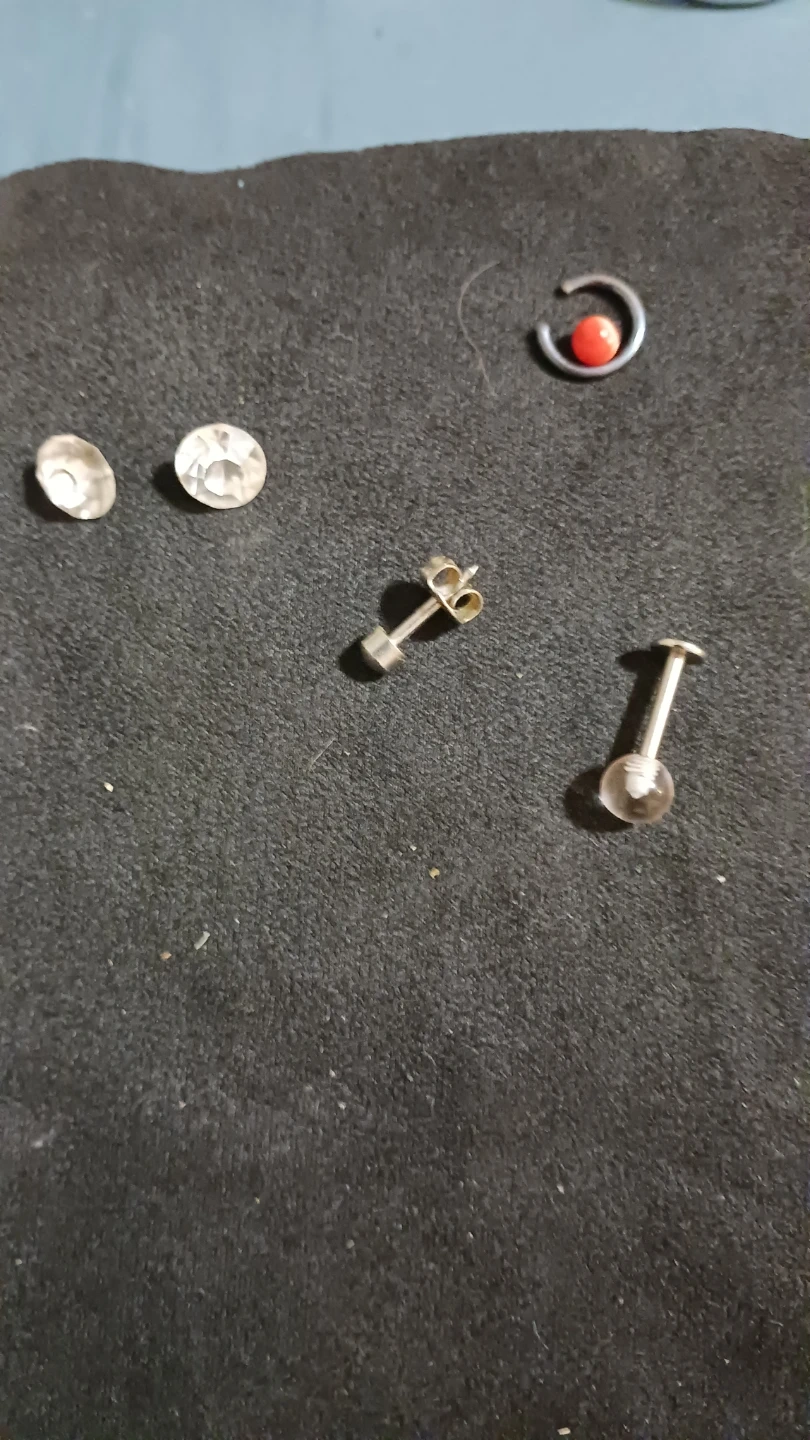 This lot includes five assorted pieces of body jewelry. There are two silver-toned stud earrings with clear stones and a faceted design. Also included is a silver-toned labret stud with a clear ball end and a blue nose ring with the small red bead. A single silver-toned post earring is also part of this lot. These are suitable for various piercings.