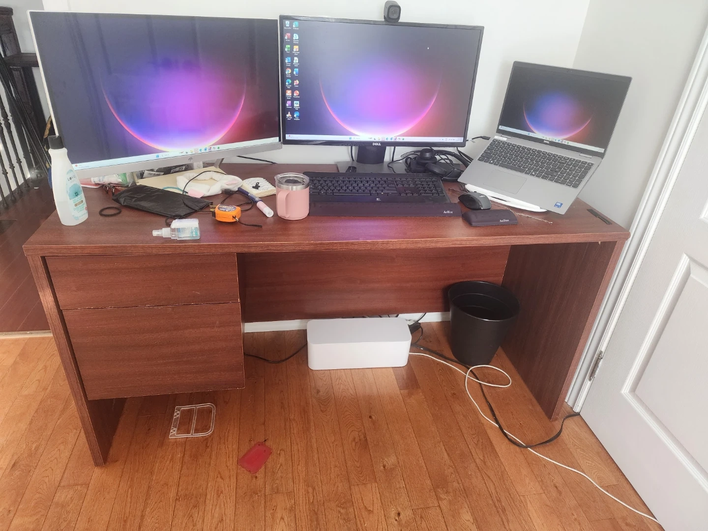 This is a dark wood computer desk with two drawers on the left side. It has plenty of surface space for monitors and a laptop. It's a sturdy desk for any home office setup.
