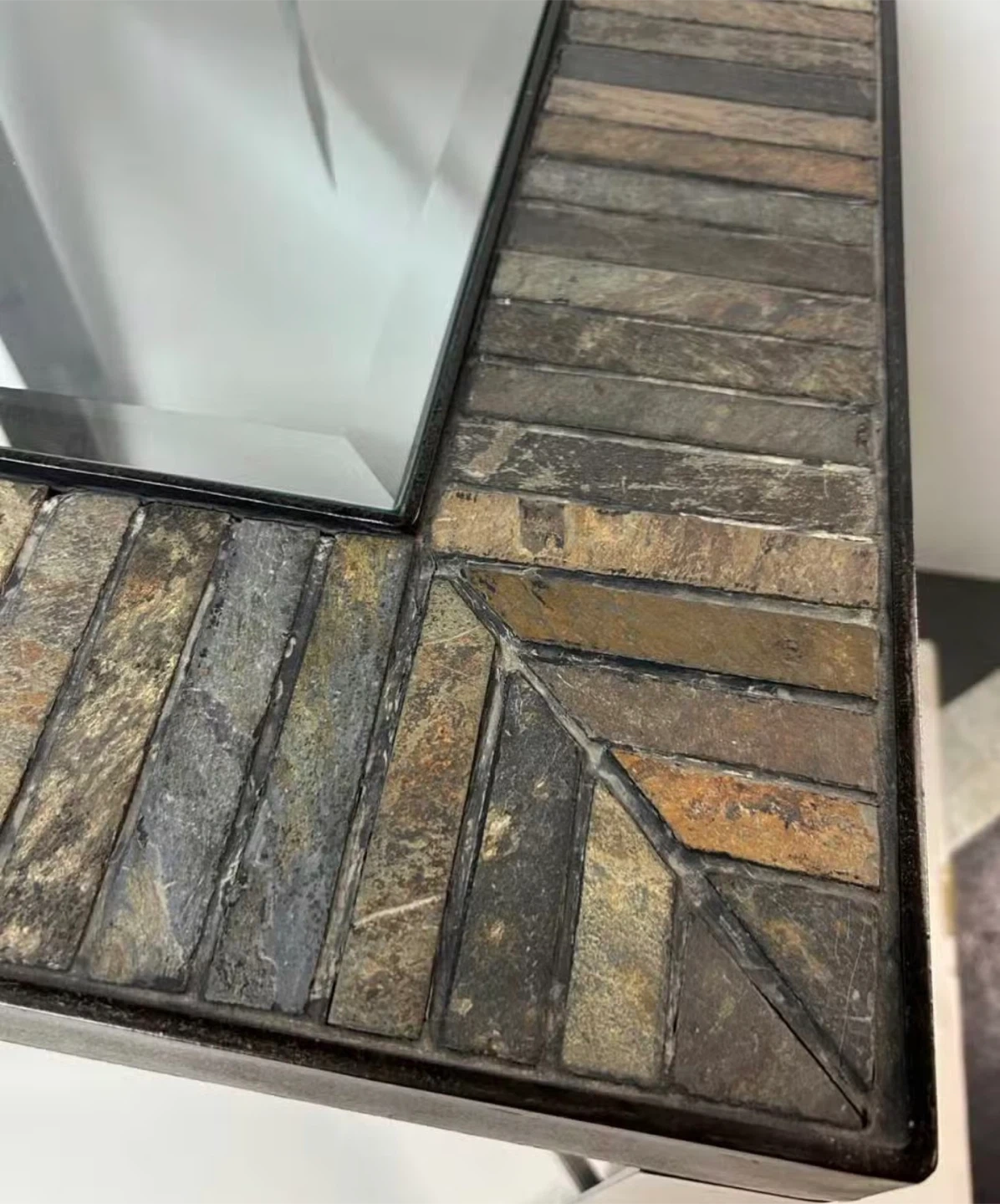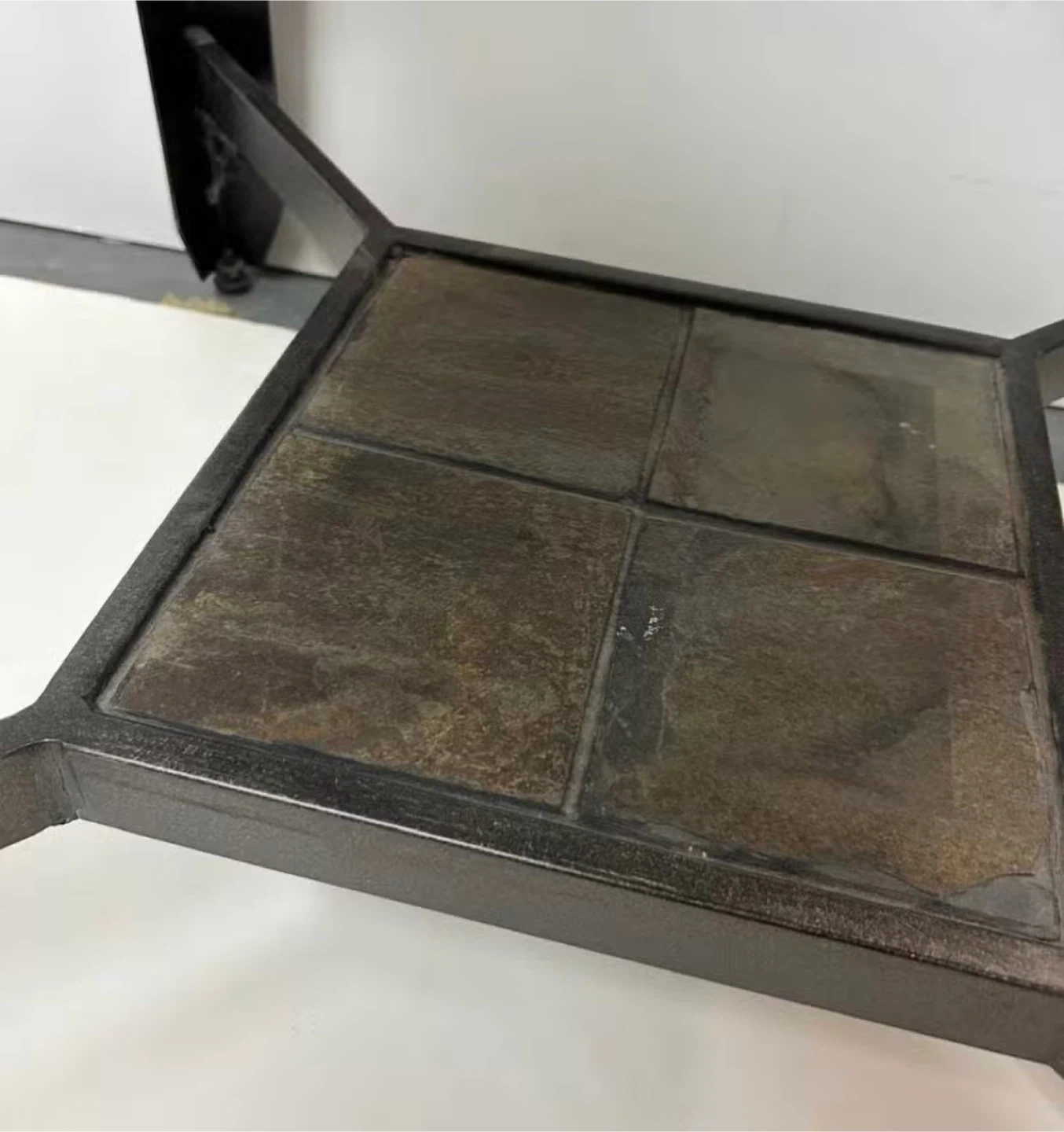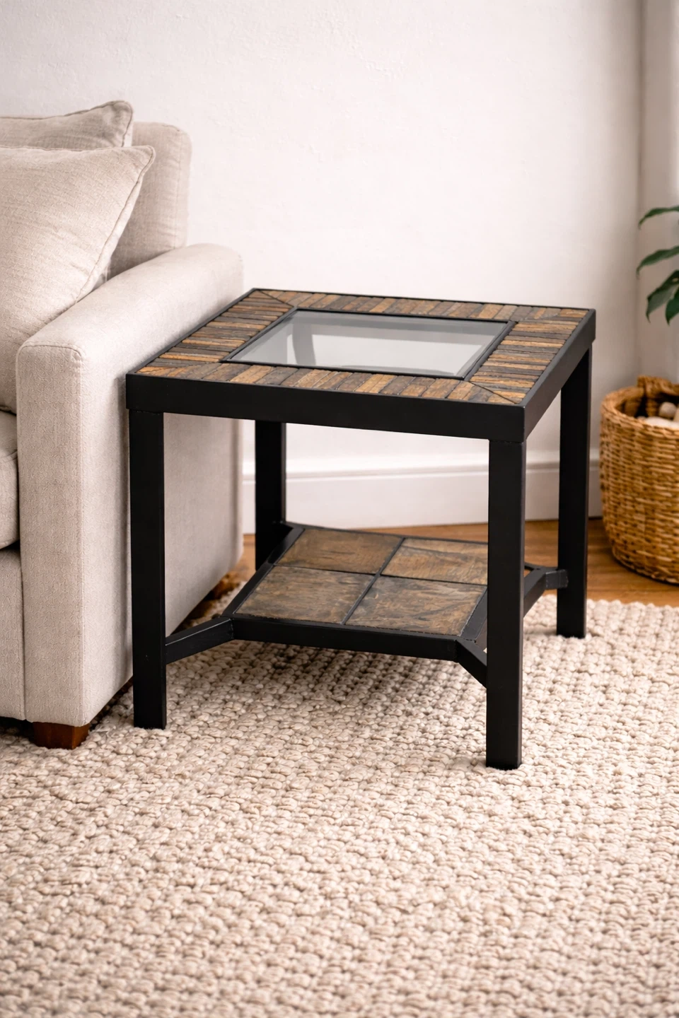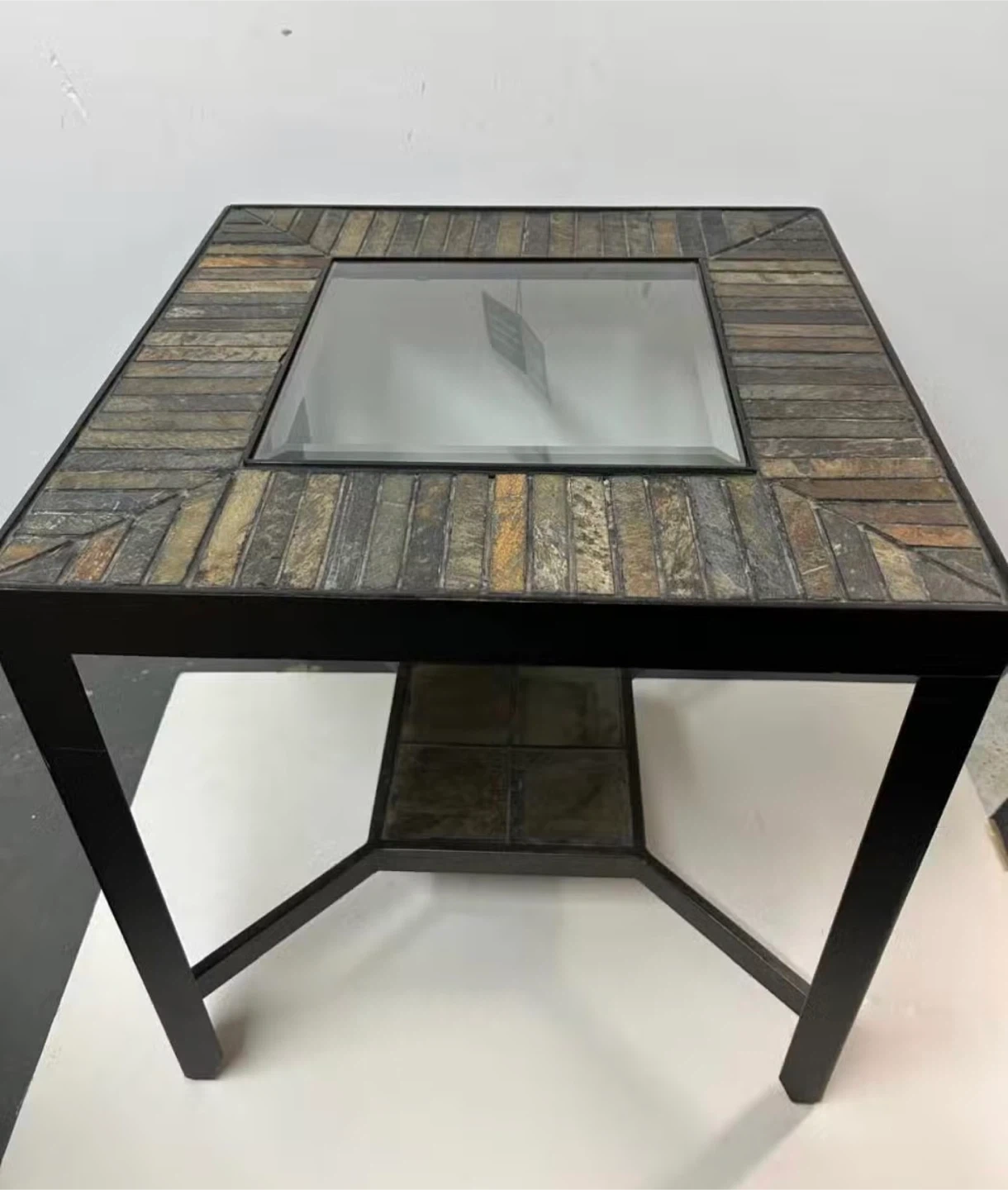 This square end table features a unique slate tile and glass inlay top. It has a sturdy black metal frame and a lower shelf with slate tile accents. Perfect for holding drinks or a lamp next to your sofa.