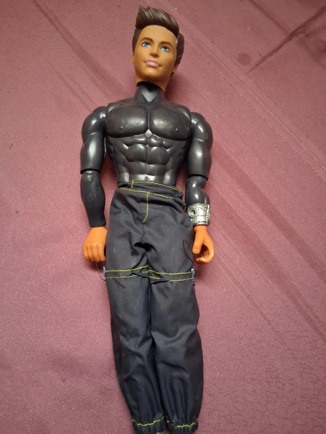 This is a male action figure doll with a muscular physique. It's wearing a black outfit with dark pants. The doll has brown hair and blue eyes. The articulated limbs allow for various poses.