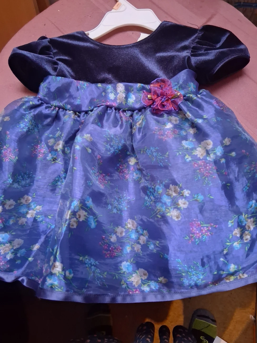This cute dress features a navy velvet bodice with short puff sleeves. The skirt is a sheer organza with a lovely blue floral print and a satin trim. It's perfect for special occasions!