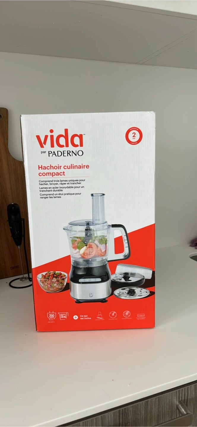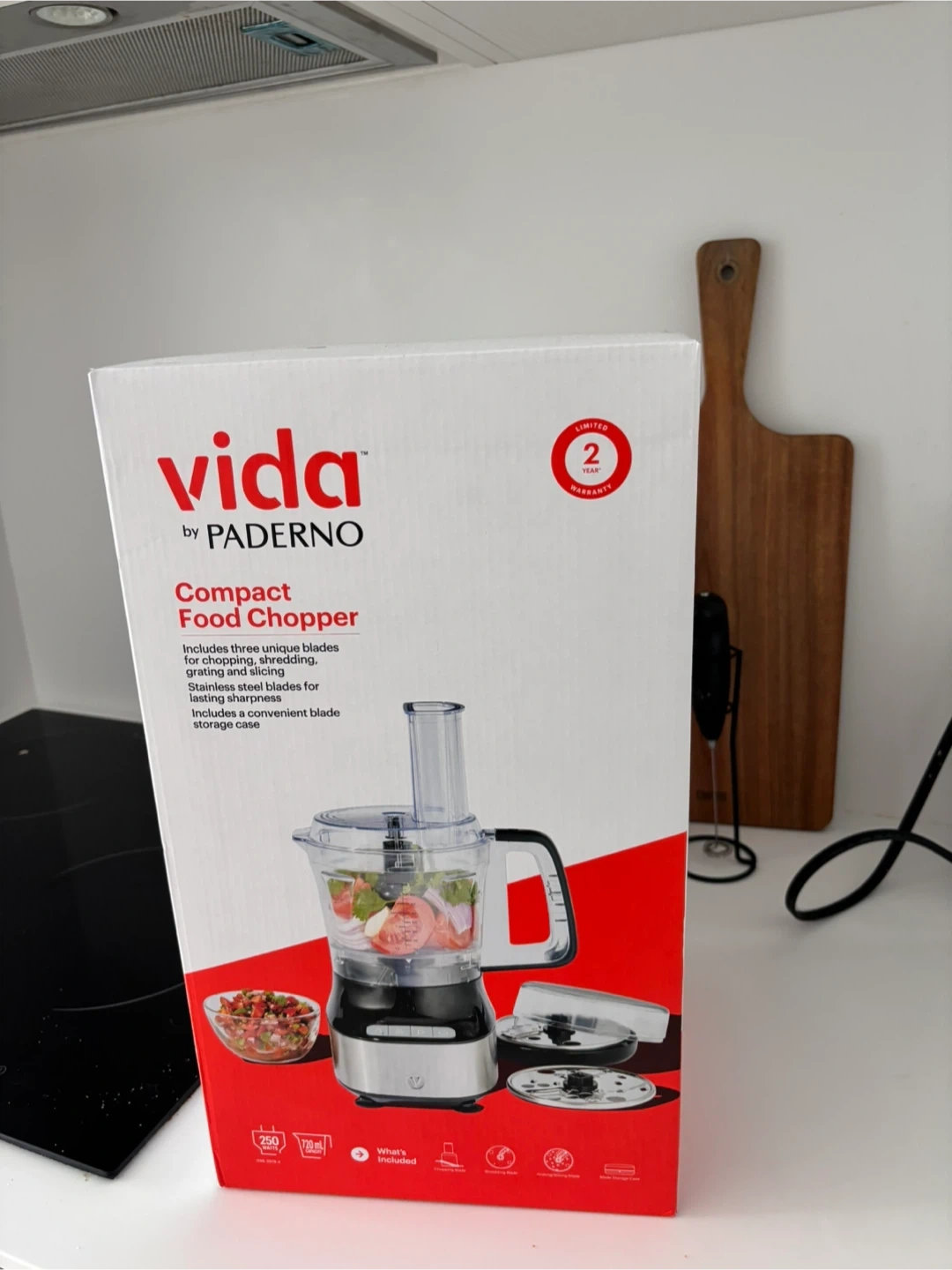 This is a Vida by Paderno compact food chopper. It includes three unique blades for chopping, grating, and slicing. The blades are made for lasting sharpness and it comes with a convenient blade storage case.