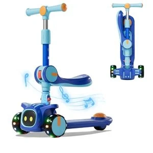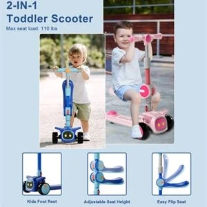 Ideal First Scooter for Kids: This 2-in-1 scooter with a flip-out seat and foot pad allows your child to scoot sitting or standing up. The handlebars can be adjusted to 3 different heights.