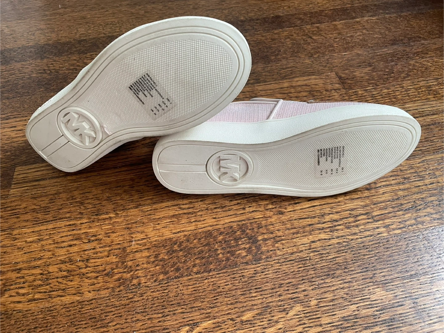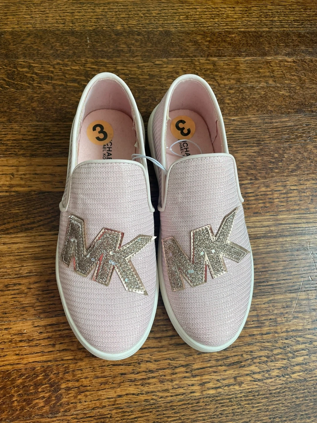 Pink Michael Kors slip-on sneakers with glittery MK logo detailing. They're kids size 3 and made with a textile upper. These are perfect for everyday wear!