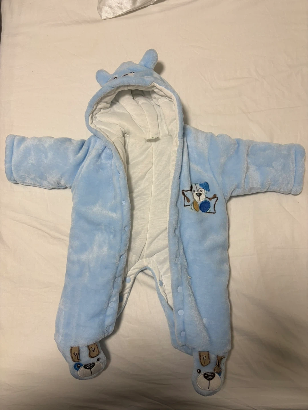 This adorable blue snowsuit is perfect for keeping your little one warm. It features a cozy hood with bear ears and built-in footies. Soft fleece material.