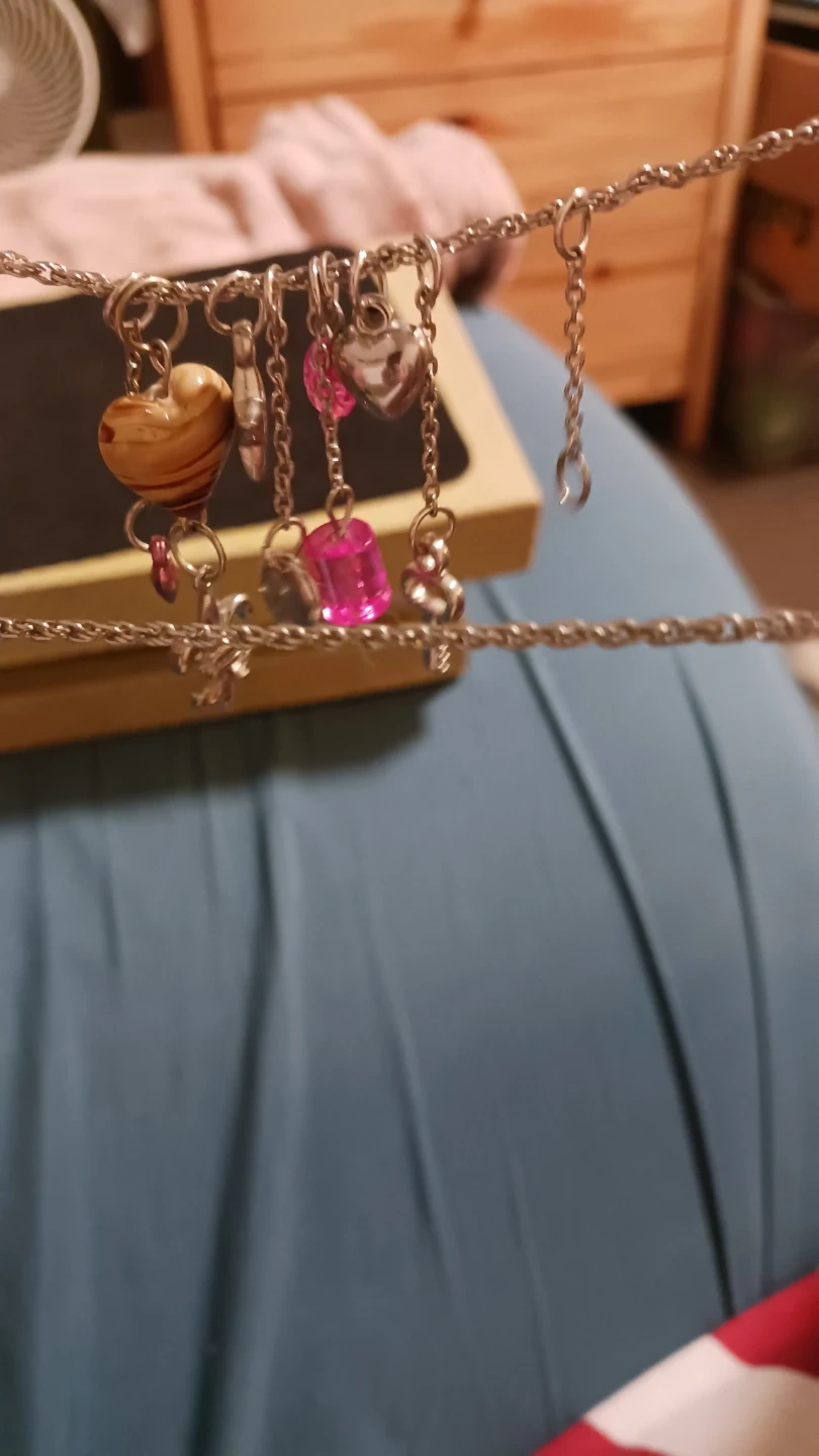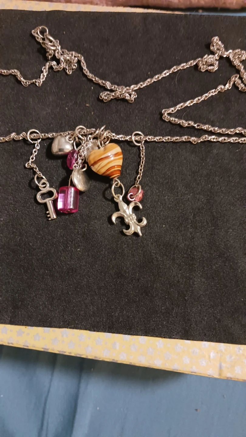 A silver-tone charm necklace featuring various decorative charms. It includes a key charm, a pink rectangular bead, a fleur-de-lis charm, and heart-shaped charms. The charms are suspended from a delicate chain.