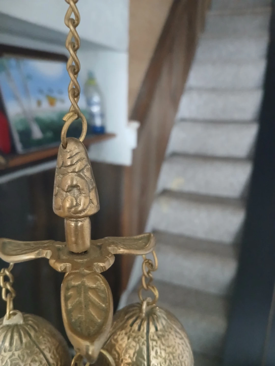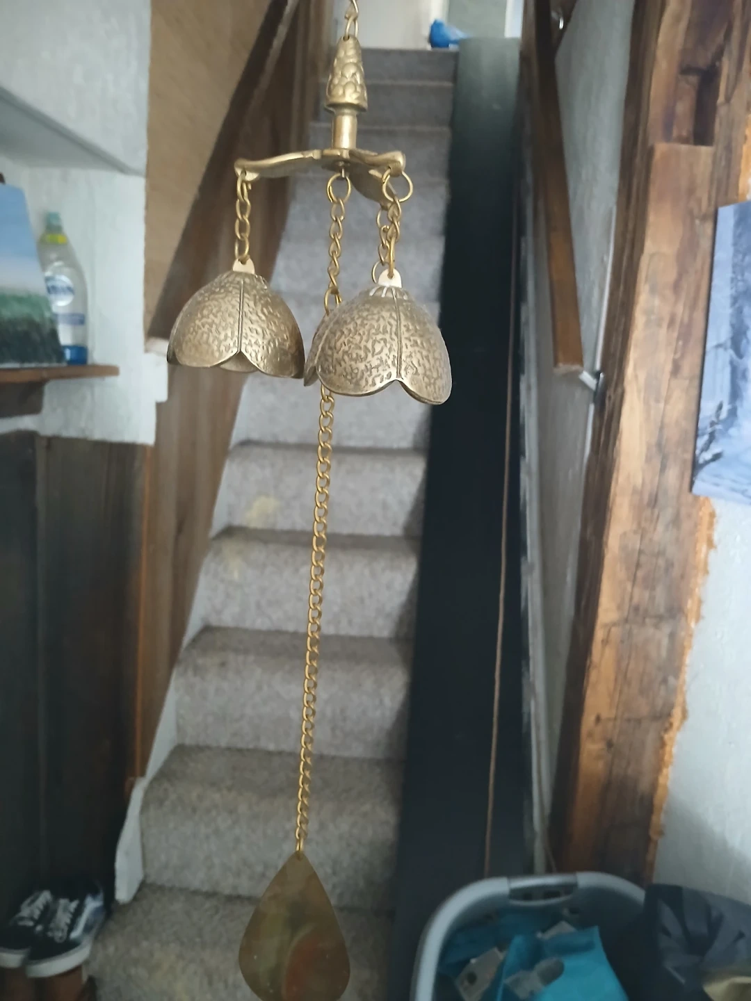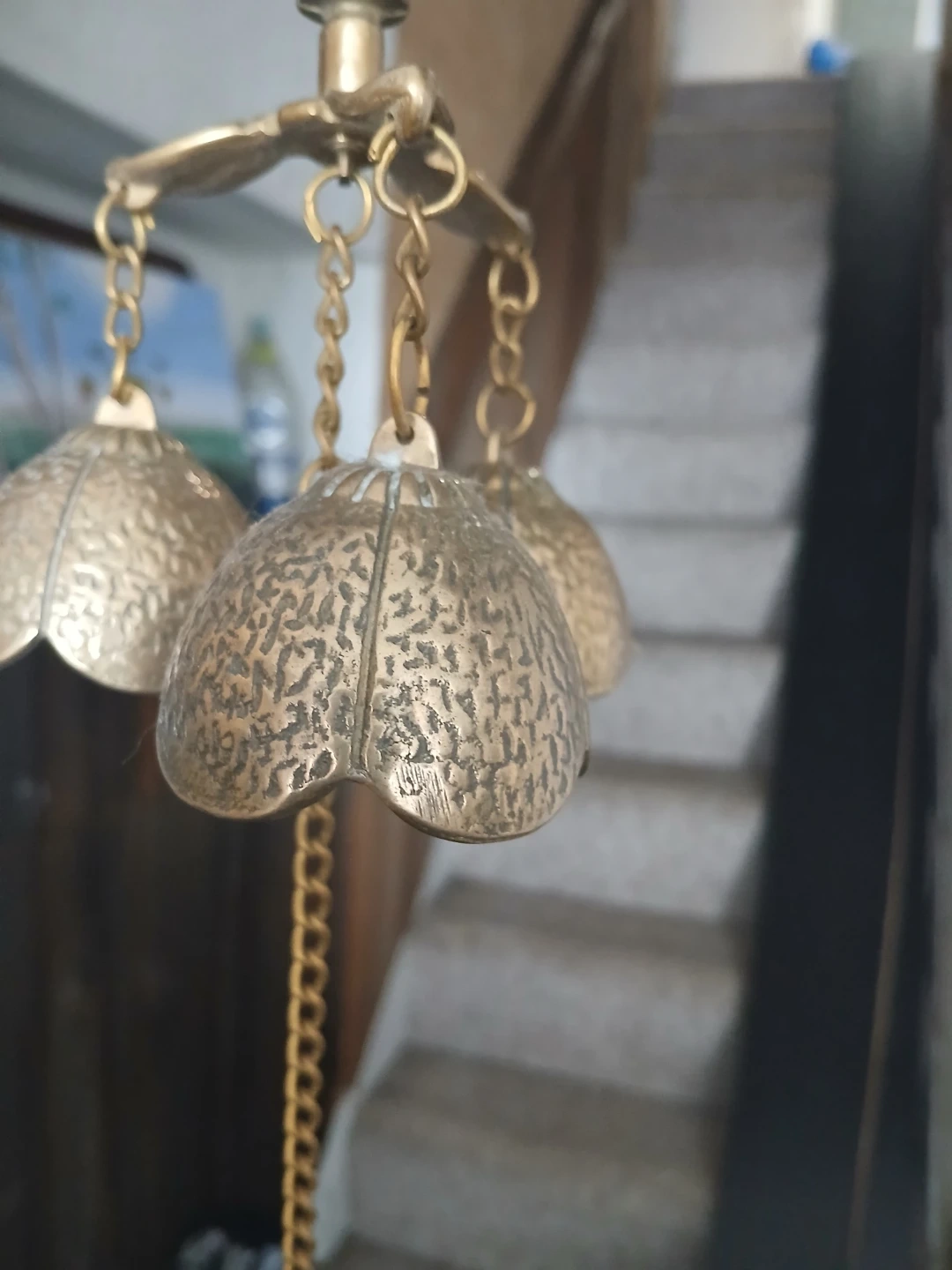 This is a decorative brass chandelier featuring three bell-shaped accents and a longer chain with a leaf-shaped pendant. It's crafted from brass with an embossed textured finish on the bells. This piece would add a unique touch to your home decor.